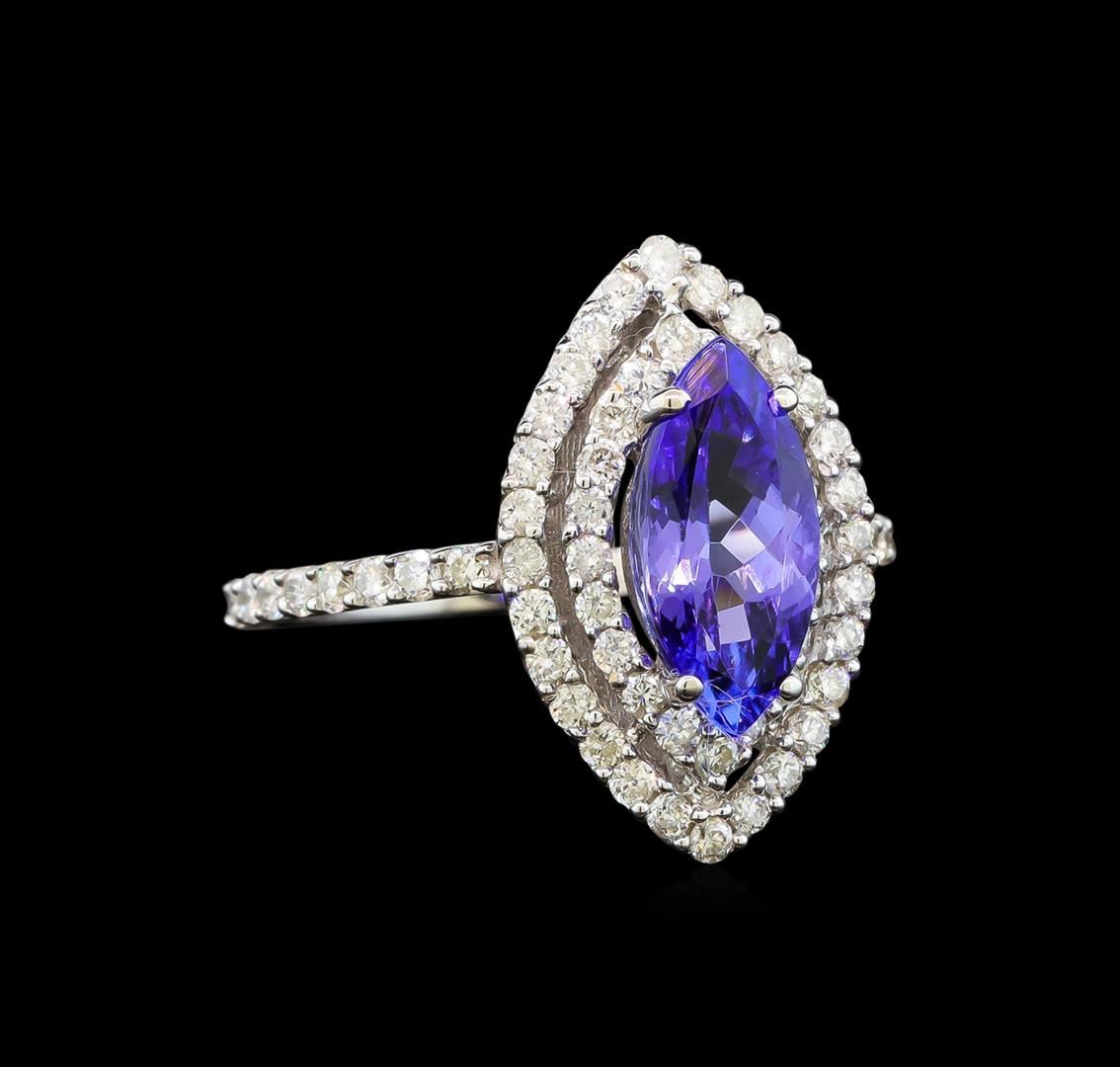 One electronically tested 14KT white gold ladies cast tanzanite and diamond ring with a bright polish finish. Identified with markings of "14K". Condition is new. Containing: One prong set marquise modified brilliant cut natural tanzanite, measuring 11.00 x 6.00 x 3.90mm, approximate weight of 1.64ct., clarity is eye clean, type I, medium light, moderately strong, violet color, (GIA V 4/4), cut is good. Sixty-Four prong set round brilliant cut diamonds, measuring 1.30 - 1.20 x 0.75mm (depth est.) approximate total weight of 64 Stones = 0.45ct. Clarity: SI-1 to I-1. Color: I - J, Cut is Good. Colored gemstones are presumed to have been subjected to commonly used enhancement processes. All diamonds and colored gemstones are graded in the mounting, unless otherwise stated. Total Weight of Colored Stones 1.64ct. Total Weight of Diamonds 0.45ct. Total Weight of Ring 4.00 grams. GGL Appraised at $3,450.00.