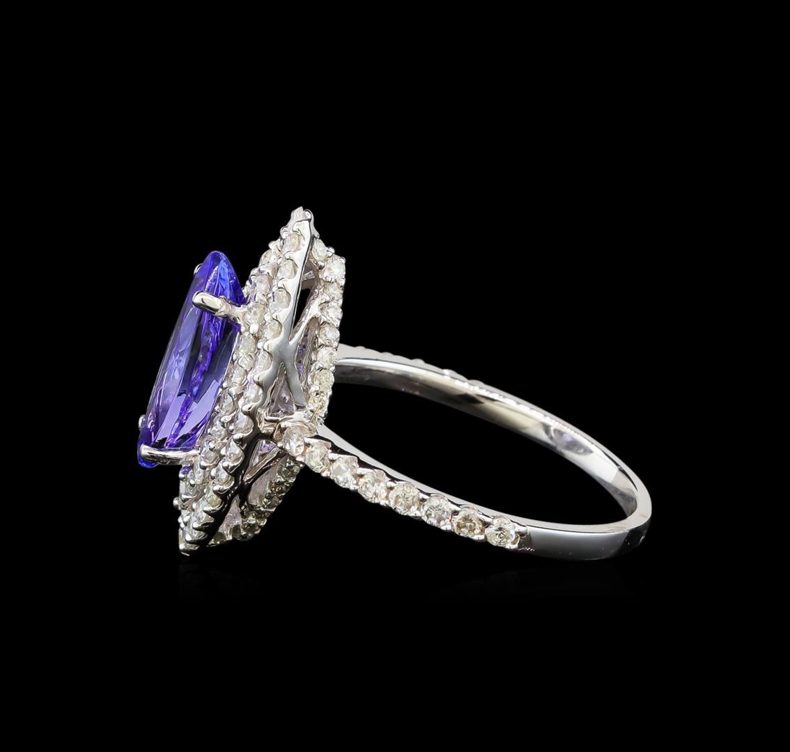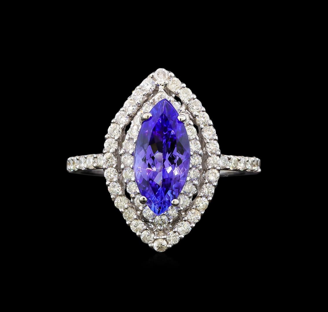 One electronically tested 14KT white gold ladies cast tanzanite and diamond ring with a bright polish finish. Identified with markings of "14K". Condition is new. Containing: One prong set marquise modified brilliant cut natural tanzanite, measuring 11.00 x 6.00 x 3.90mm, approximate weight of 1.64ct., clarity is eye clean, type I, medium light, moderately strong, violet color, (GIA V 4/4), cut is good. Sixty-Four prong set round brilliant cut diamonds, measuring 1.30 - 1.20 x 0.75mm (depth est.) approximate total weight of 64 Stones = 0.45ct. Clarity: SI-1 to I-1. Color: I - J, Cut is Good. Colored gemstones are presumed to have been subjected to commonly used enhancement processes. All diamonds and colored gemstones are graded in the mounting, unless otherwise stated. Total Weight of Colored Stones 1.64ct. Total Weight of Diamonds 0.45ct. Total Weight of Ring 4.00 grams. GGL Appraised at $3,450.00.