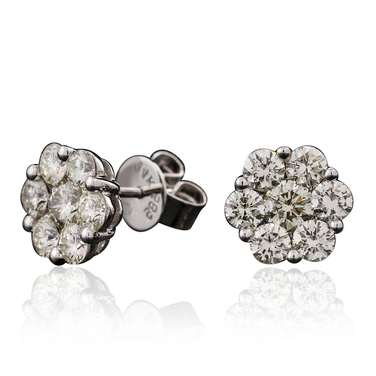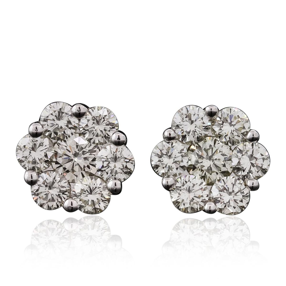 One pair electronically tested 14KT white gold ladies combination cast & assembled diamond stud earrings with friction posts with a bright polish finish. Identified with markings of "14K 585". Condition is new. Containing: Two prong set round brilliant cut diamonds, measuring 4.00 - 4.00 x 2.40mm (depth est.) approximate total weight of 2 Stones = 0.47ct. Clarity: SI-1. Color: K, Cut is Very Good. Twelve prong set round brilliant cut diamonds, measuring 3.00 - 3.00 x 1.80mm (depth est.) approximate total weight of 12 Stones = 1.19ct. Clarity: SI-1. Color: J, Cut is Very Good. All diamonds are graded in the mounting, unless otherwise stated. Total Weight of Diamonds 1.65ct. Total Weight of Earrings 2.90 grams. GGL Appraised at $5,830.00.