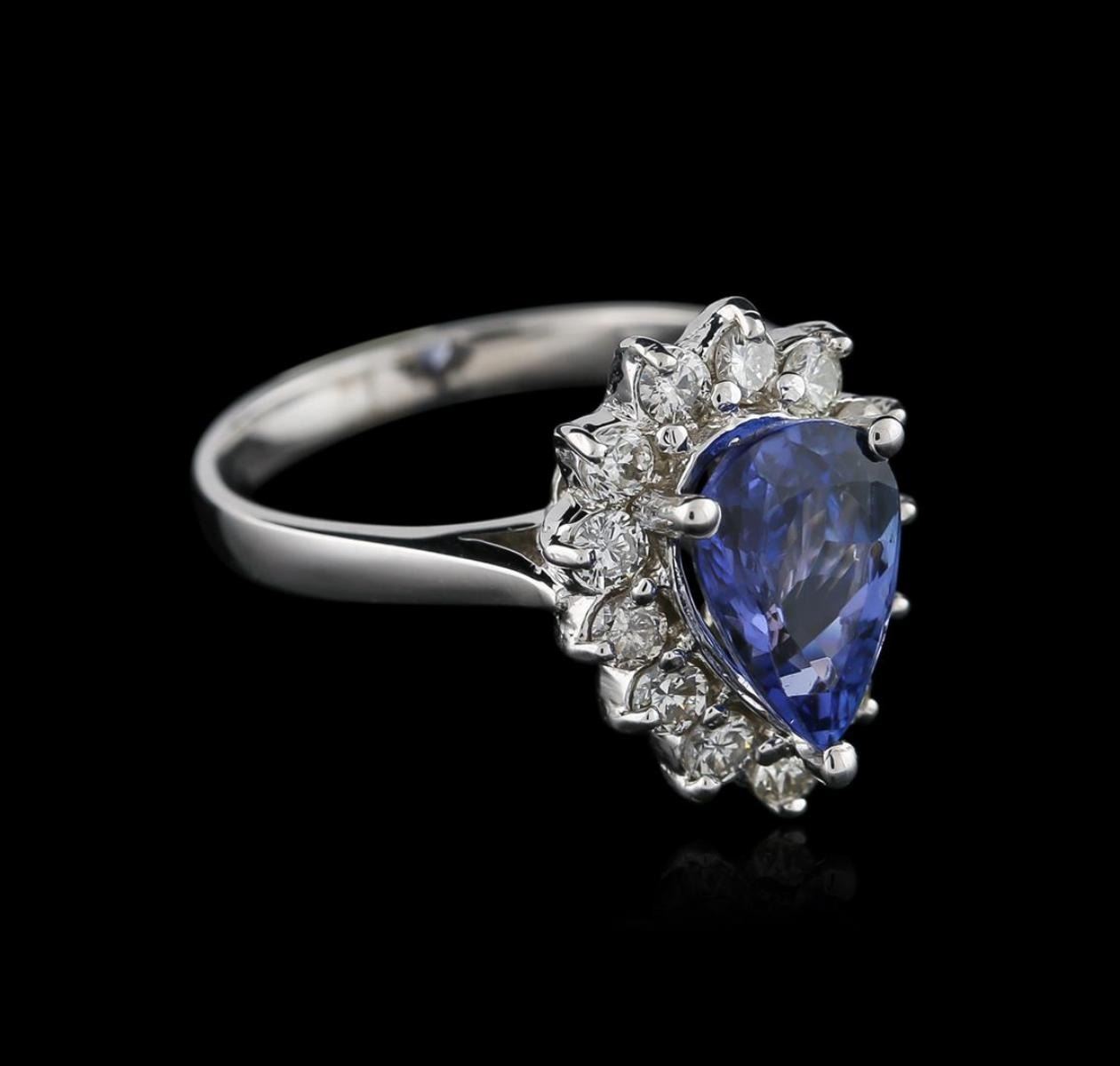 One electronically tested 14KT white gold ladies cast tanzanite and diamond ring with a cathedral shank with a bright polish finish. Identified with markings of "K14". Condition is new. Containing: One prong set pear modified brilliant cut natural tanzanite, measuring 9.46 x 6.90 x 3.80mm, approximate weight of 1.66ct., clarity is eye clean, type I, medium, very slightly grayish, violet color, (GIA V 5/3), cut is good. Thirteen prong set round brilliant cut diamonds, measuring 2.20 - 2.20 x 1.32mm (depth est.) approximate total weight of 13 Stones = 0.51ct. Clarity: SI-1 to I-1. Color: K - L, Cut is Good. All diamonds and colored gemstones are graded in the mounting, unless otherwise stated. Colored gemstones are presumed to have been subjected to commonly used enhancement processes.. Total Weight of Colored Stones 1.66ct. Total Weight of Diamonds 0.51ct. Total Weight of Ring 4.50 grams. GGL Appraised.
