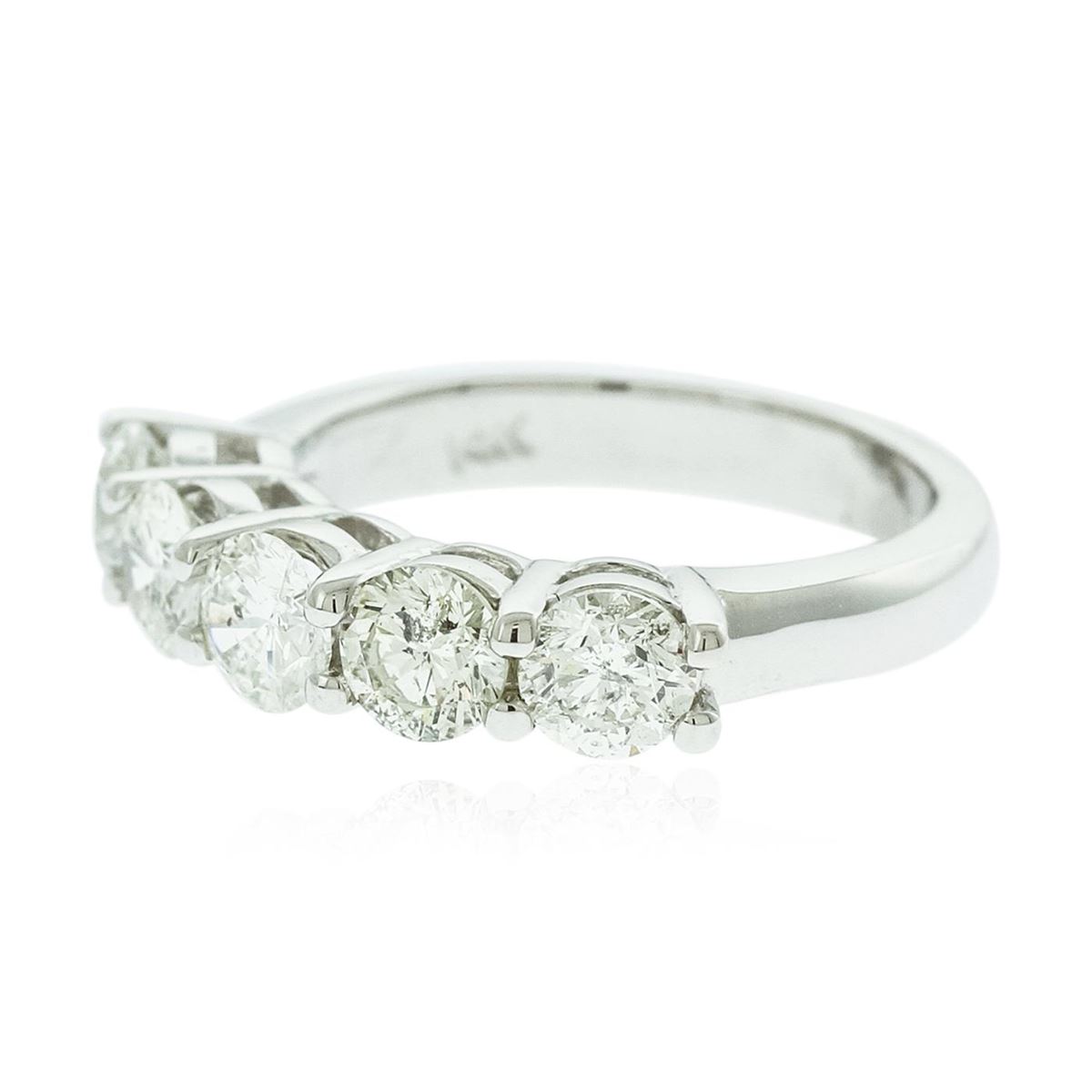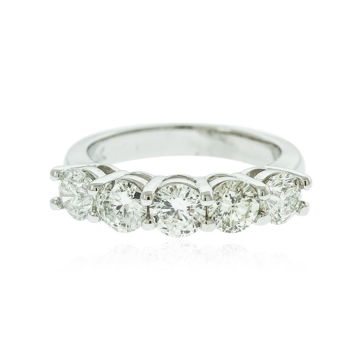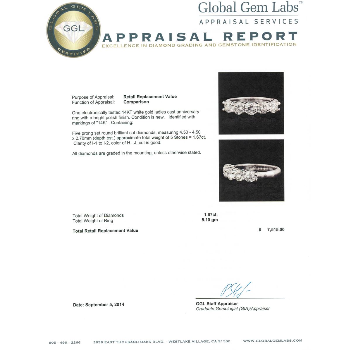 One electronically tested 14KT white gold ladies cast anniversary ring with a bright polish finish. Identified with markings of "14K". Condition is new. Containing: Five prong set round brilliant cut diamonds, measuring 4.50 - 4.50 x 2.70mm (depth est.) approximate total weight of 5 Stones = 1.67ct. Clarity: I-1 to I-2. Color: H - J, Cut is Good. All diamonds are graded in the mounting, unless otherwise stated. Total Weight of Diamonds 1.67ct. Total Weight of Ring 5.10 grams. GGL Appraised at $7,515.00.