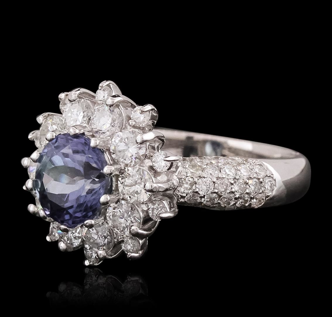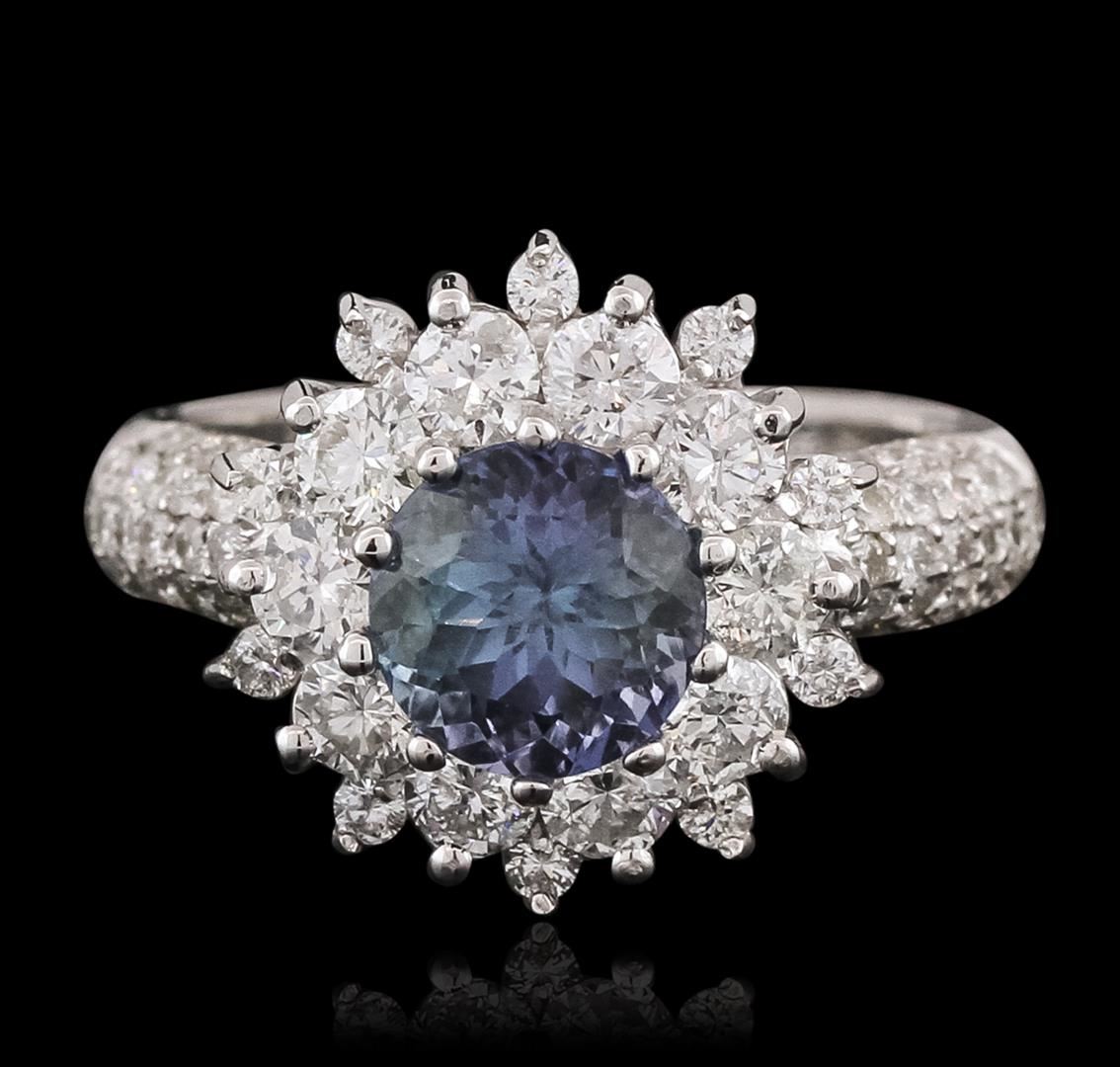 One electronically tested 14KT white gold ladies combination cast & assembled ring with a bright polish finish. Identified with markings of "585". Condition is new. Containing: One prong set round modified brilliant cut natural tanzanite, measuring 7.28 - 7.21 x 4.71 mm, approximate weight of 1.67ct., clarity is eye clean, type I, medium dark, very slightly grayish, violet color, (GIA V 6/3), cut is good. Sixty-Two prong set round brilliant cut diamonds, measuring 1.30 - 1.30 x 0.78mm (depth est.) approximate total weight of 62 Stones = 0.50ct. Clarity: SI-2 to I-1. Color: I - J, Cut is Good. Ten prong set round brilliant cut diamonds, measuring 2.80 - 2.80 x 1.68mm (depth est.) approximate total weight of 10 Stones = 0.80ct. Clarity: I-1. Color: J, Cut is Good. Colored gemstones are presumed to have been subjected to commonly used enhancement processes. All diamonds and colored gemstones are graded in the mounting, unless otherwise stated. Total Weight of Colored Stones 1.67ct. Total Weight of Diamonds 1.30ct. Total Weight of Ring 5.50 grams. GGL Appraised at $7,215.00.