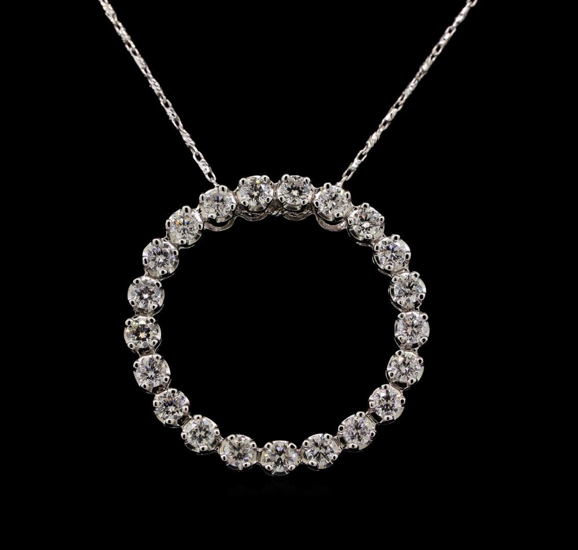 One electronically tested 14KT white gold ladies cast diamond pendant & chain 18.0" long, with a spring ring clasp with a bright polish finish. Identified with markings of "14K". Condition is new. Containing: Twenty-One prong set round brilliant cut diamonds, measuring 2.80 - 2.80 x 1.68mm (depth est.) approximate total weight of 21 Stones = 1.69ct. Clarity: SI-2 to I-1. Color: I - J, Cut is Good. All diamonds are graded in the mounting, unless otherwise stated. Total Weight of Diamonds 1.69ct. Total Weight of Pendant & Chain 5.90 grams. GGL Appraised at $4,290.00.