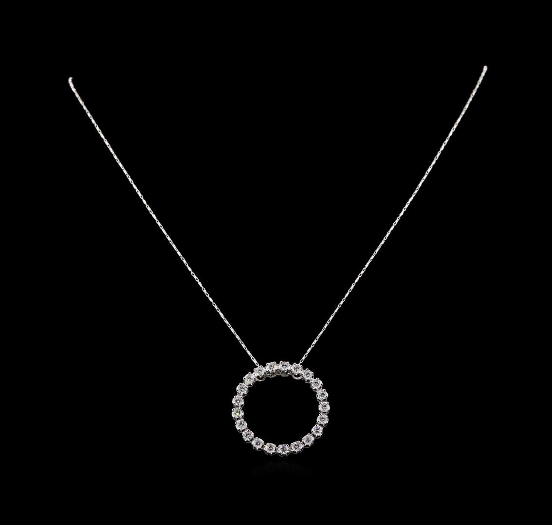 One electronically tested 14KT white gold ladies cast diamond pendant & chain 18.0" long, with a spring ring clasp with a bright polish finish. Identified with markings of "14K". Condition is new. Containing: Twenty-One prong set round brilliant cut diamonds, measuring 2.80 - 2.80 x 1.68mm (depth est.) approximate total weight of 21 Stones = 1.69ct. Clarity: SI-2 to I-1. Color: I - J, Cut is Good. All diamonds are graded in the mounting, unless otherwise stated. Total Weight of Diamonds 1.69ct. Total Weight of Pendant & Chain 5.90 grams. GGL Appraised at $4,290.00.