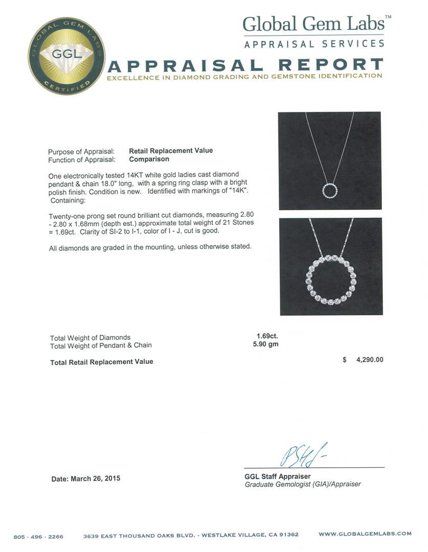 One electronically tested 14KT white gold ladies cast diamond pendant & chain 18.0" long, with a spring ring clasp with a bright polish finish. Identified with markings of "14K". Condition is new. Containing: Twenty-One prong set round brilliant cut diamonds, measuring 2.80 - 2.80 x 1.68mm (depth est.) approximate total weight of 21 Stones = 1.69ct. Clarity: SI-2 to I-1. Color: I - J, Cut is Good. All diamonds are graded in the mounting, unless otherwise stated. Total Weight of Diamonds 1.69ct. Total Weight of Pendant & Chain 5.90 grams. GGL Appraised at $4,290.00.