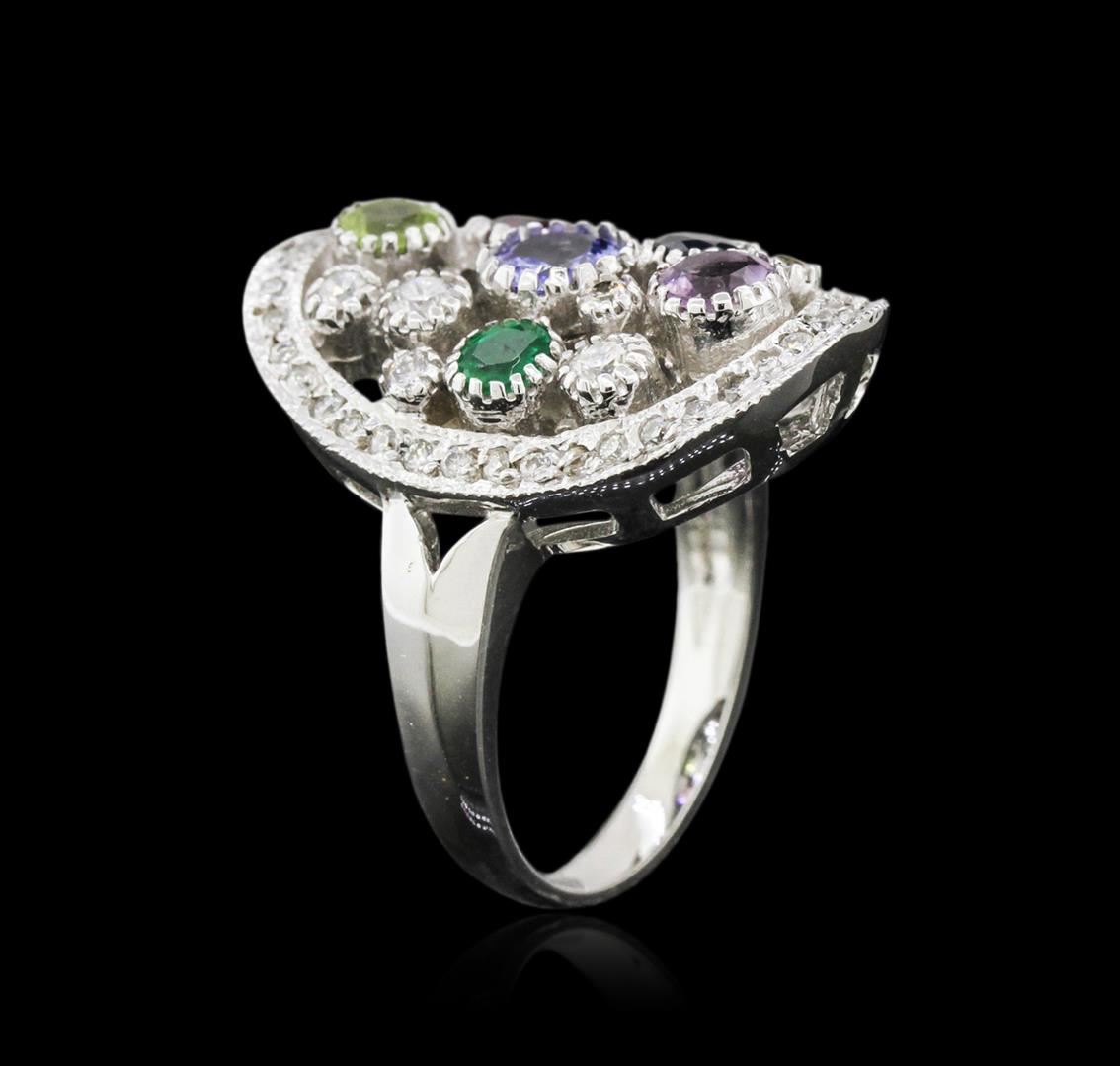 One electronically tested 14KT white gold ladies cast multi gemstone and diamond ring. The ring features an organized multi gemstone and diamond cluster set within a diamond bezel, completed by a two and one-half millimeter wide band. Bright polish finish with milgrain detailing. Identified with markings of "K14". Condition is new, good workmanship. Containing: One bezel set round brilliant cut natural amethyst, measuring 5.00 - 5.00 x 2.55 mm, approximate weight of 0.34ct., clarity is eye clean, type II, medium, very slightly grayish, purple color, (GIA P 5/3), cut is good. Transmitting light with no distortion, transparent. Graded in the setting. One bezel set round brilliant cut natural almandite garnet, measuring 4.00 - 4.00 x 2.30 mm, approximate weight of 0.30ct., clarity is eye clean, type II, dark, very slightly brownish, strongly purplish red color, (GIA stpR 7/3), cut is good. Transmitting light with no distortion, transparent. Graded in the setting. Two bezel set round brilliant cut natural blue and pink sapphires, measuring 4.00 - 3.50 x 2.44 mm, approximate total weight of 0.62ct., clarity is eye clean, cut is good. Transmitting light with no distortion, transparent. Graded in the setting. One bezel set round brilliant cut natural peridot, measuring 4.00 - 4.00 x 2.60 mm, approximate weight of 0.28ct., clarity is eye clean, type II, medium dark, very slightly grayish, yellowish green color, (GIA yG 6/3), cut is good. Transmitting light with no distortion, transparent. Graded in the setting. One bezel set round brilliant cut natural emerald, measuring 3.50 - 3.50 x 2.28 mm, approximate weight of 0.15ct., clarity is moderately included, type III, medium dark, very slightly grayish, very slightly bluish green color, (GIA vslbG 6/3), cut is good. Transmitting light somewhat diffusely, transparent to translucent. Naturally occurring internal & external characteristics are present. Graded in the setting. Eight bezel set round brilliant cut diamonds, measuring 2.50 - 1.80 x 1.29mm (depth est.) approximate total weight of 8 Stones = 0.39ct. Graded in the setting. Clarity: SI-1 to I-1. Color: G - I Forty prong set round brilliant cut diamonds, measuring 1.30 - 1.20 x 0.75mm (depth est.) approximate total weight of 40 Stones = 0.38ct. Graded in the setting. Clarity: SI-1 to I-1. Color: G - I. Total Weight of Colored Stones 1.69ct. Total Weight of Diamonds 0.77ct. Total Weight of Ring 8.79 grams. AIG Appraised at $4,295.00.