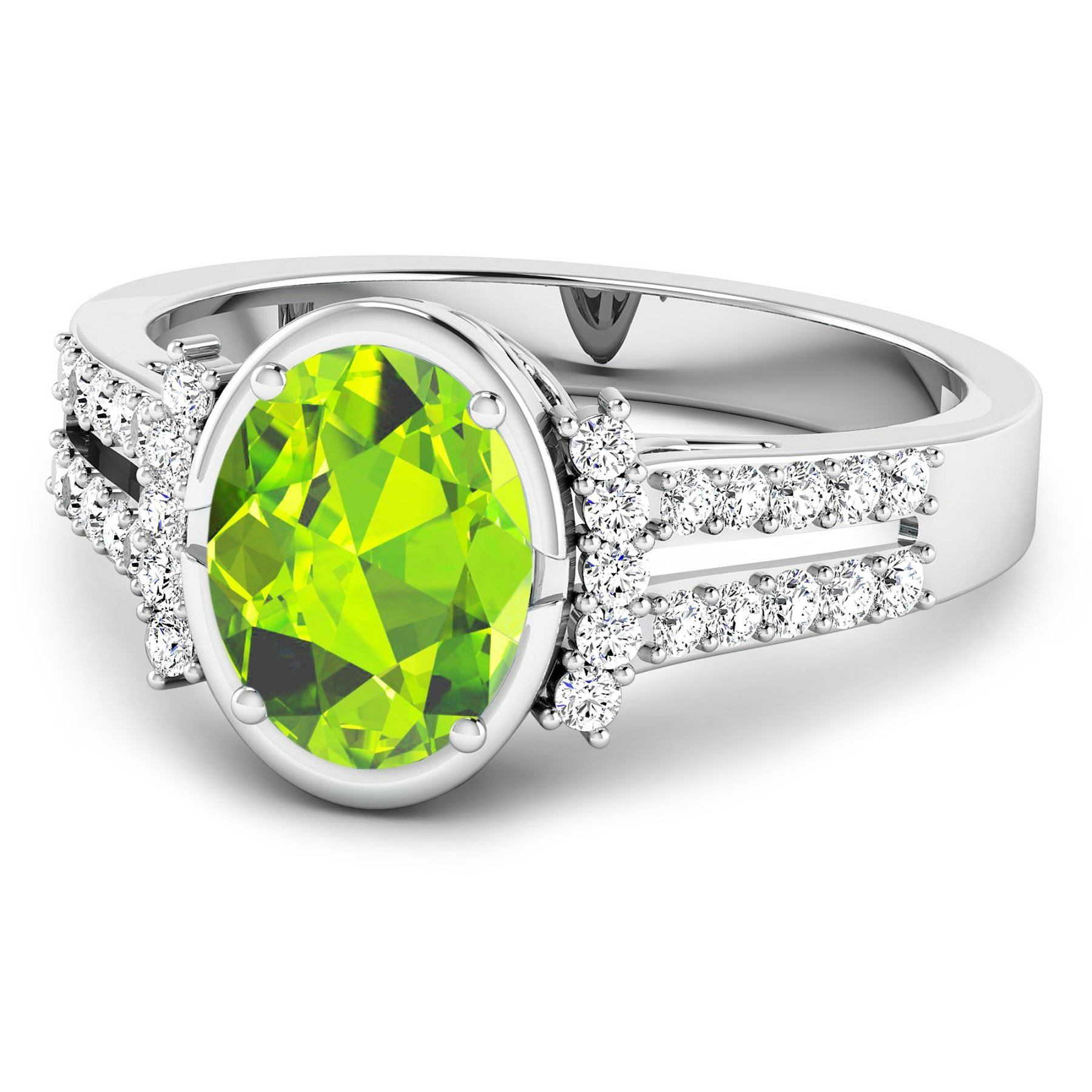 Peridot Oval 9x7mm - 1Pc + White Diamond F/C Round 1.30mm - 30Pcs ( SI-2/HI ) Total weight of gemstone is 1.6cts. Total Diamond weight is 0.3cts. Total weight of this ring is 3.23 grams. Ring size 7.