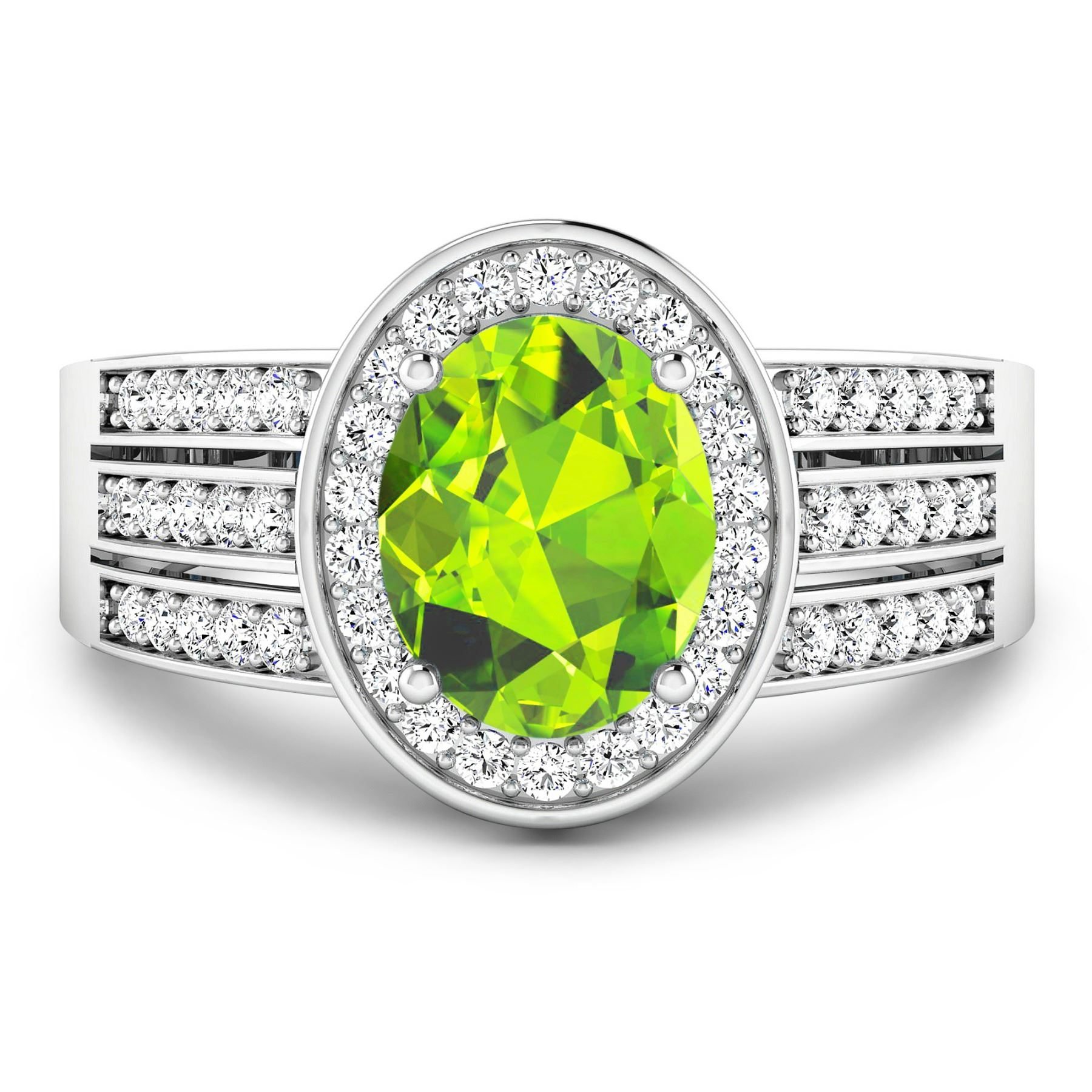 Peridot Oval 9x7mm - 1Pc + White Diamond F/C Round 1.30mm - 32Pcs + White Diamond F/C Round 1.20mm - 6Pcs + White Diamond F/C Round 1.10mm - 6Pcs + White Diamond F/C Round 1.00mm - 8Pcs ( SI-2/HI ) Total weight of gemstone is 1.6cts. Total Diamond weight is 0.44cts. Total weight of this ring is 3.58 grams. Ring size 7.