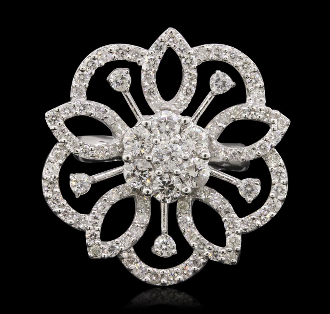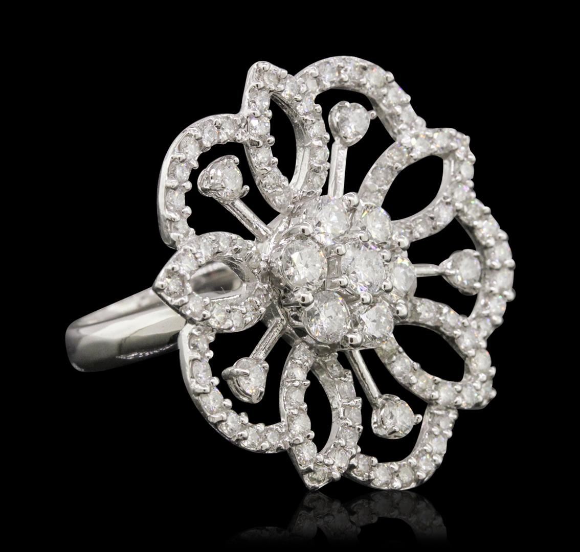 One electronically tested 14KT white gold ladies combination cast & assembled ring with a bright polish finish. Condition is new. Identified with markings of "K14". Containing: Twelve prong set round brilliant cut diamonds, measuring 3.60 - 2.10 x 1.71mm (depth est.) approximate. Total Weight of 12 Stones = 1.02ct. Clarity: SI-2 to I-1. Color: I - J, Cut is Good. Eighty-Five prong set round brilliant cut diamonds, measuring 1.30 - 1.30 x 0.78mm (depth est.) approximate. Total Weight of 85 Stones = 0.68ct. Clarity: I-1 to I-2. Color: I - J, Cut is Good. All diamonds are graded in the mounting, unless otherwise stated. Total Weight of Diamonds 1.70ct. Total Weight of Ring 9.80 grams. GGL Appraised at $7,395.00.