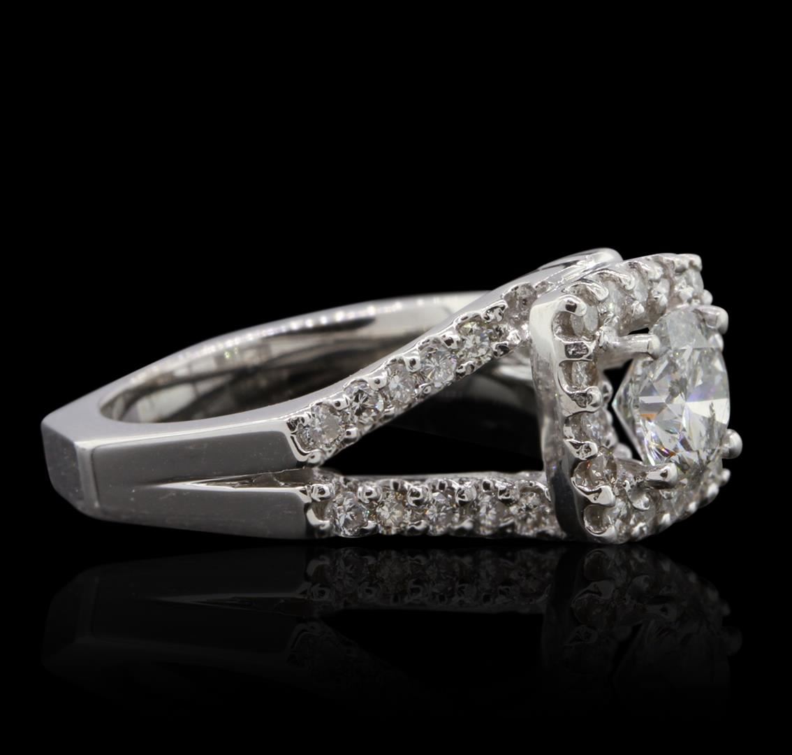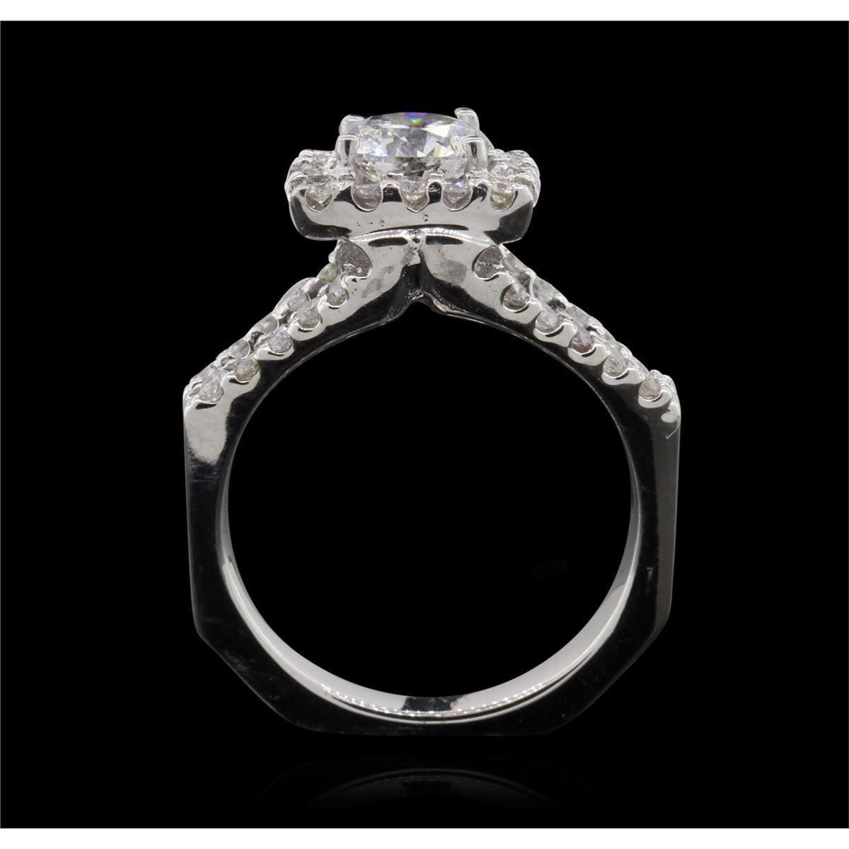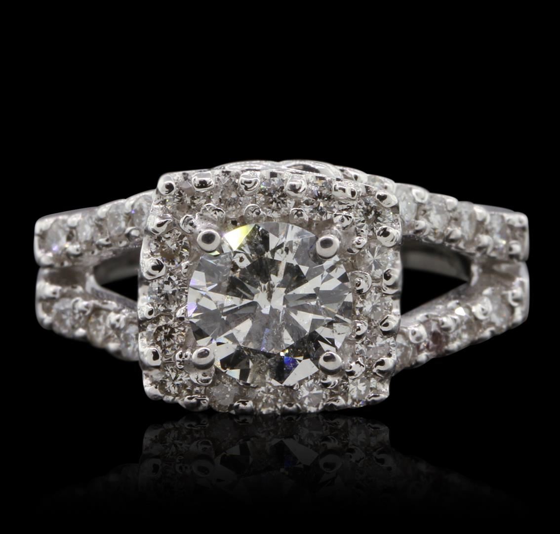 One electronically tested 14KT white gold Ladies combination cast & assembled engagement ring with a bright polish finish. Trademark is 6.6. Identified with markings of "14K". Condition is excellent. Containing: One prong set round brilliant cut diamond, measuring 6.50 - 6.50 x 4.00mm (depth est.) approximate weight of 1.05ct. Clarity of I-2, Color of J, Cut is Good. Thirty-Seven prong set round brilliant cut diamonds, measuring 1.70 - 1.70 x 1.02mm (depth est.) approximate total weight of 37 Stones = 0.65ct. Clarity of SI-1 to SI-2, Color of H - I. Total Weight of Diamonds 1.70ct. Total Weight of Ring 6.90gm. GGL Appraised at $12,315.00.
