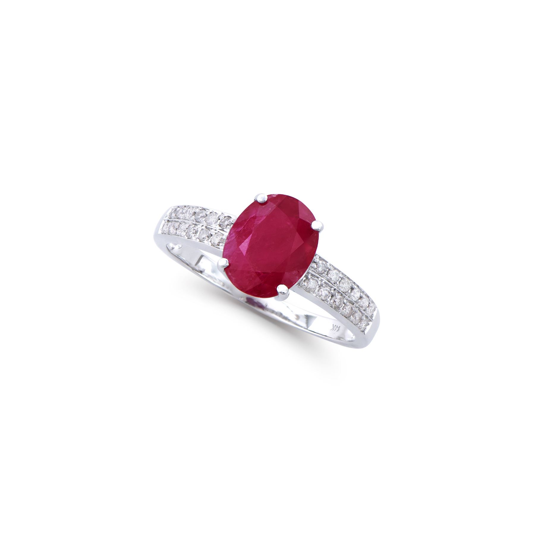One 14KT White Gold 1.70ct Ruby and Diamond Ring. (1) Oval Ruby stone with a total weight of 1.70cts. (24) round Diamonds with a total weight of 0.18cts with a color of H-I and clarity of I1-I2. Total weight of this ring is 2.0 grams. Ring size is 7.5.