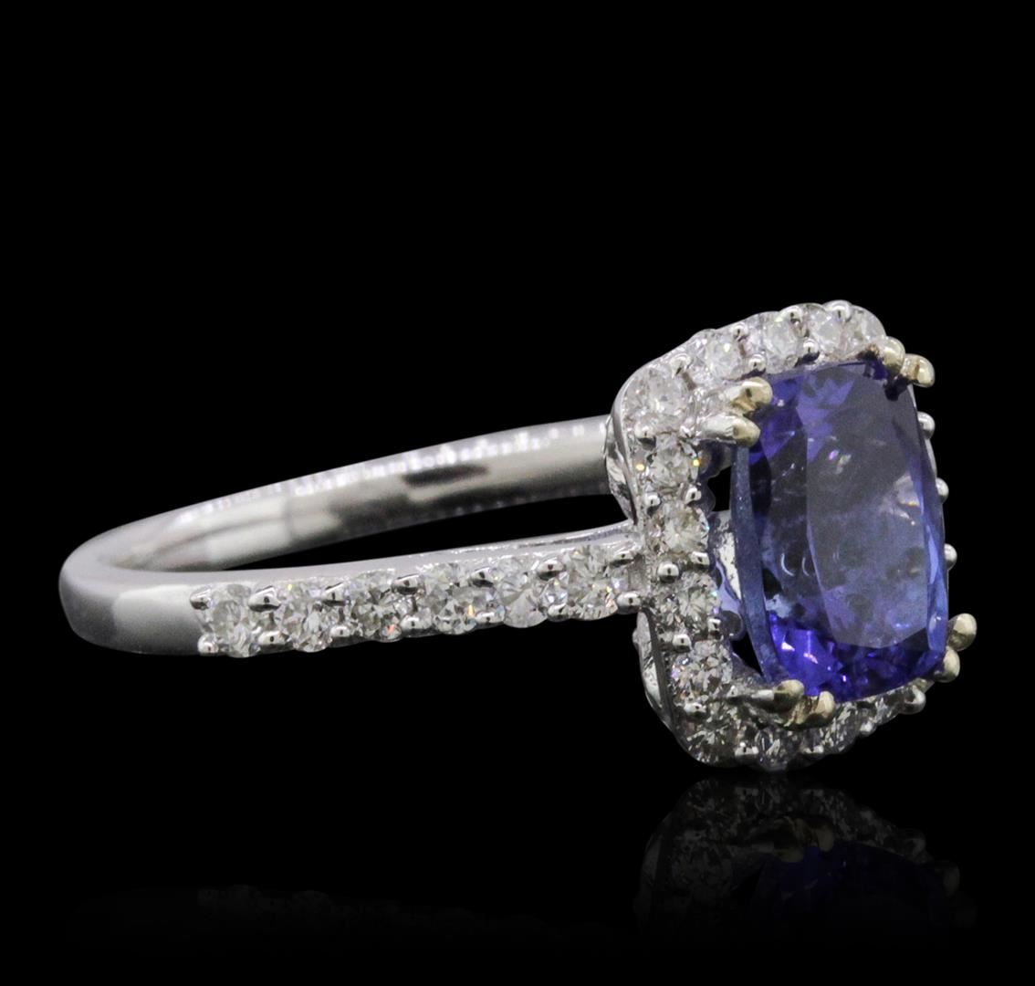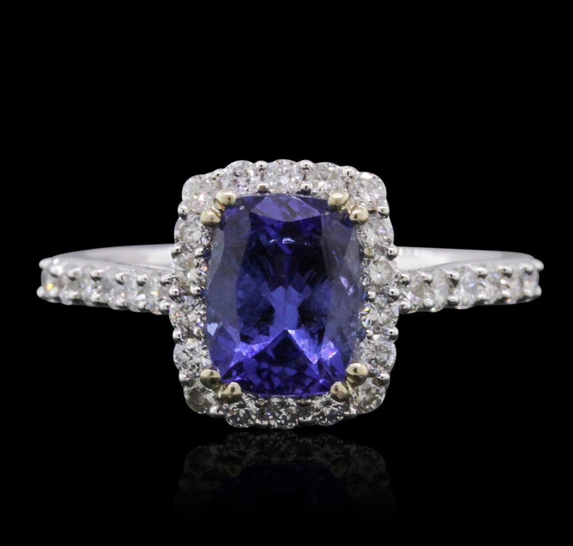 One electronically tested 14KT white gold ladies cast tanzanite and diamond ring with a bright polish finish. The featured tanzanite is set within a diamond ring supported by diamond set shoulders, completed by a one and one-half millimeter wide band. Trademark is Orianne. Identified with markings of "14K". Condition is new, good workmanship. Containing: One prong set rectangular cushion brilliant cut natural tanzanite, measuring 8.10 x 6.20 x 4.00mm, 8% bulge factor, approximate weight of 1.71ct., clarity is eye clean, type I, medium dark, very slightly grayish, violetish blue color, (GIA vB 6/3), cut is good. Transmitting light with no distortion, transparent. Graded in the setting. Tanzanite is a very rare gemstone that is only found in the country of Tanzania. Originally discovered in 1967. Tiffany & Company, named the stone Tanzanite. It is found in the Usumburu Mountains that border the Umba Valley of northern Tanzania. Tanzanite occurs in gray, brown, violet, blue, reddish-purple, & green. The gem is interesting because of its exceptional pleochroism. Rotated in different directions a tanzanite will exhibit multiple changes of color. Tanzanite has a low tolerance to ultrasonic cleaning, and should not be cleaned using this method. Fifty-Four prong set round brilliant cut diamonds, measuring 1.70 - 1.60 x 0.99mm (depth est.) approximate total weight of 54 Stones = 0.98ct. Graded in the setting. Clarity: SI-1 to I-1. Color: H - J. Total Weight of Colored Stones 1.71ct. Total Weight of Diamonds 0.98ct. Total Weight of Ring 3.56 grams. AIG Appraised at $6,845.00.