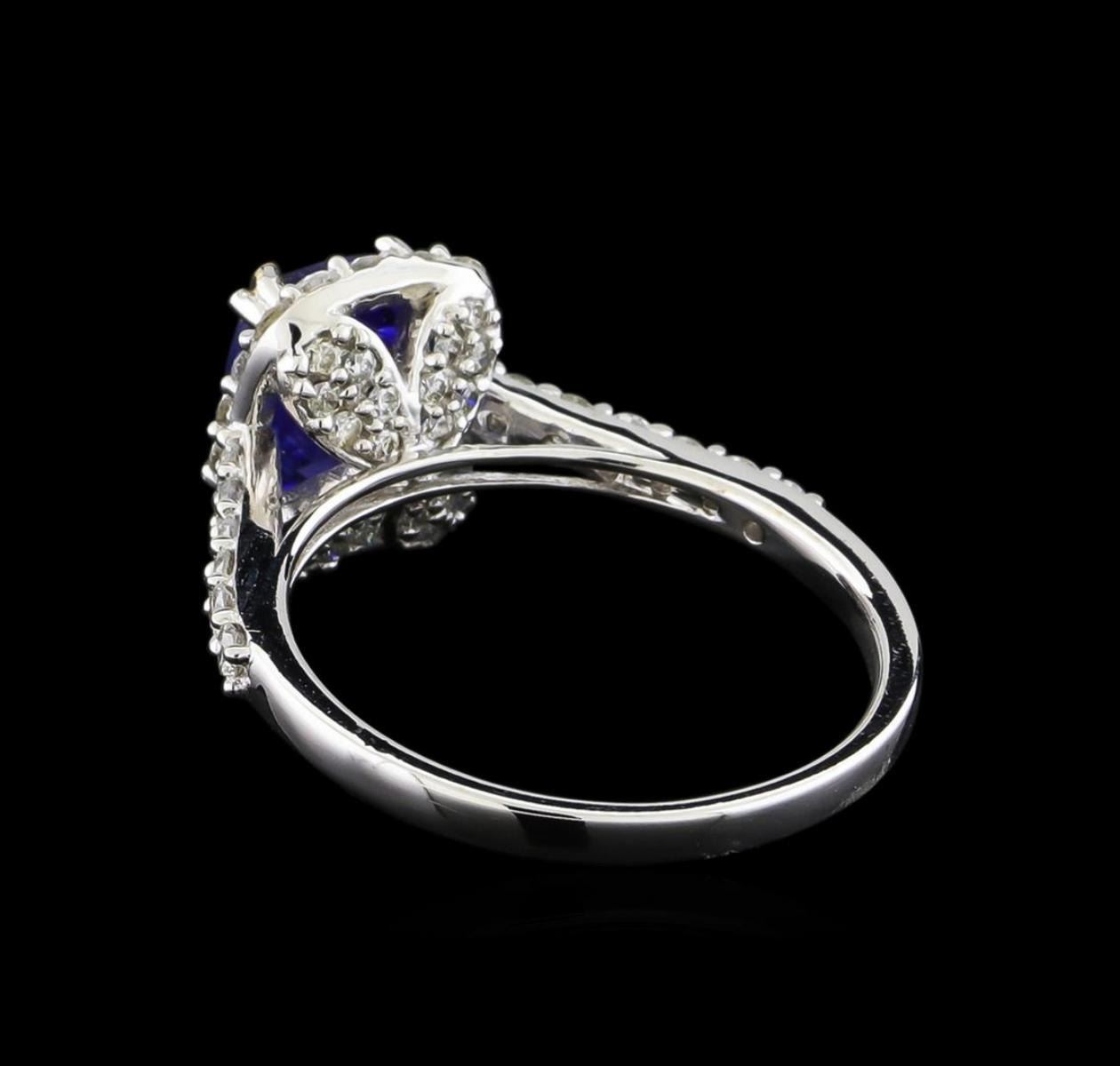 One electronically tested 14KT white gold ladies cast tanzanite and diamond ring with a bright polish finish. The featured tanzanite is set within a diamond ring supported by diamond set shoulders, completed by a one and one-half millimeter wide band. Trademark is Orianne. Identified with markings of "14K". Condition is new, good workmanship. Containing: One prong set rectangular cushion brilliant cut natural tanzanite, measuring 8.10 x 6.20 x 4.00mm, 8% bulge factor, approximate weight of 1.71ct., clarity is eye clean, type I, medium dark, very slightly grayish, violetish blue color, (GIA vB 6/3), cut is good. Transmitting light with no distortion, transparent. Graded in the setting. Tanzanite is a very rare gemstone that is only found in the country of Tanzania. Originally discovered in 1967. Tiffany & Company, named the stone Tanzanite. It is found in the Usumburu Mountains that border the Umba Valley of northern Tanzania. Tanzanite occurs in gray, brown, violet, blue, reddish-purple, & green. The gem is interesting because of its exceptional pleochroism. Rotated in different directions a tanzanite will exhibit multiple changes of color. Tanzanite has a low tolerance to ultrasonic cleaning, and should not be cleaned using this method. Fifty-Four prong set round brilliant cut diamonds, measuring 1.70 - 1.60 x 0.99mm (depth est.) approximate total weight of 54 Stones = 0.98ct. Graded in the setting. Clarity: SI-1 to I-1. Color: H - J. Total Weight of Colored Stones 1.71ct. Total Weight of Diamonds 0.98ct. Total Weight of Ring 3.56 grams. AIG Appraised.