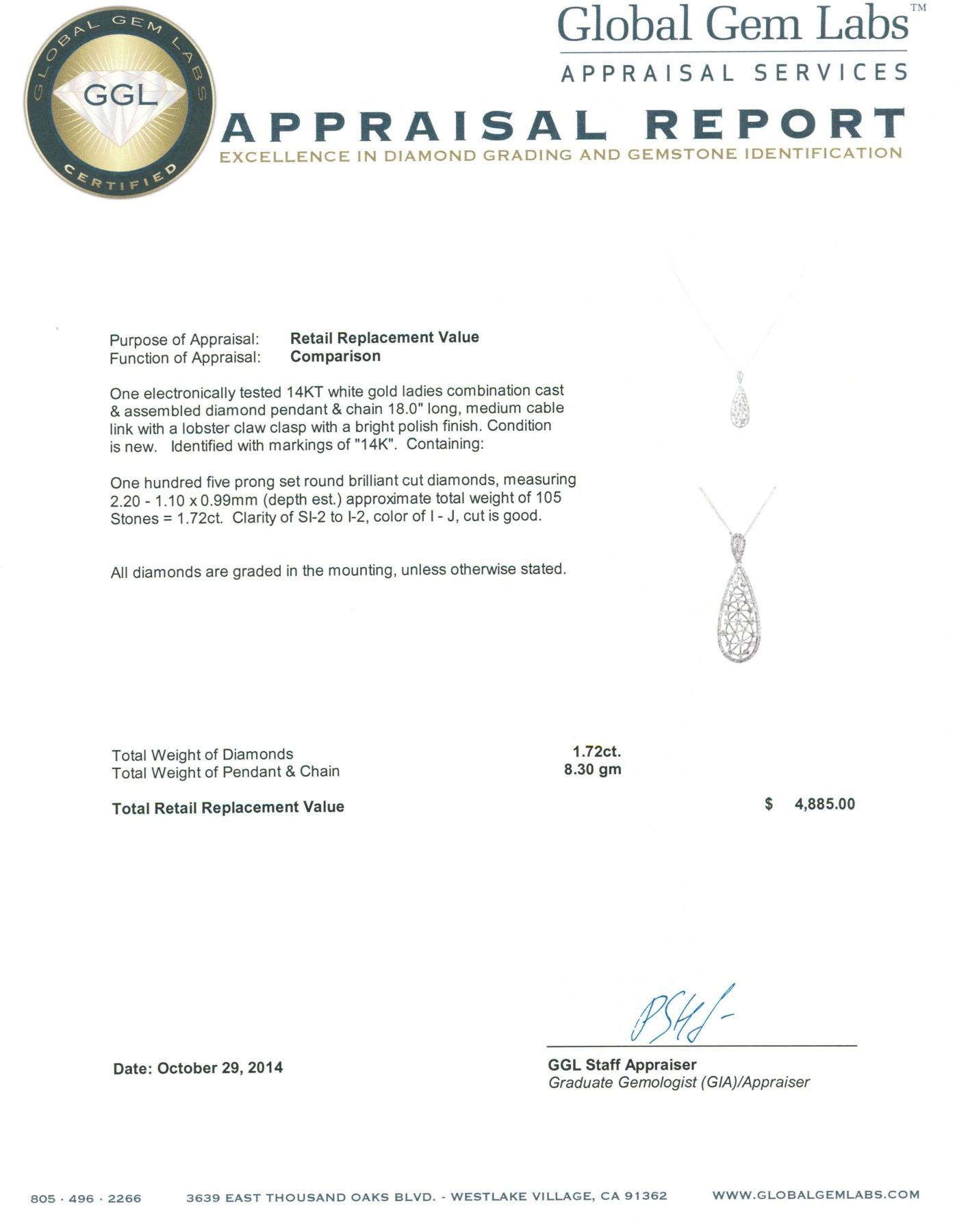 One electronically tested 14KT white gold ladies combination cast & assembled diamond pendant & chain 18.0 long, medium cable link with a lobster claw clasp with a bright polish finish. Identified with markings of 14K. Condition is new. Containing: One Hundred Five prong set round brilliant cut diamonds, measuring 2.20 - 1.10 x 0.99mm (depth est.) approximate total weight of 105 Stones = 1.72ct. Clarity: SI-2 to I-2. Color: I - J, Cut is Good. All diamonds are graded in the mounting, unless otherwise stated. Total Weight of Diamonds 1.72ct. Total Weight of Pendant & Chain 8.30 grams. GGL Appraised.