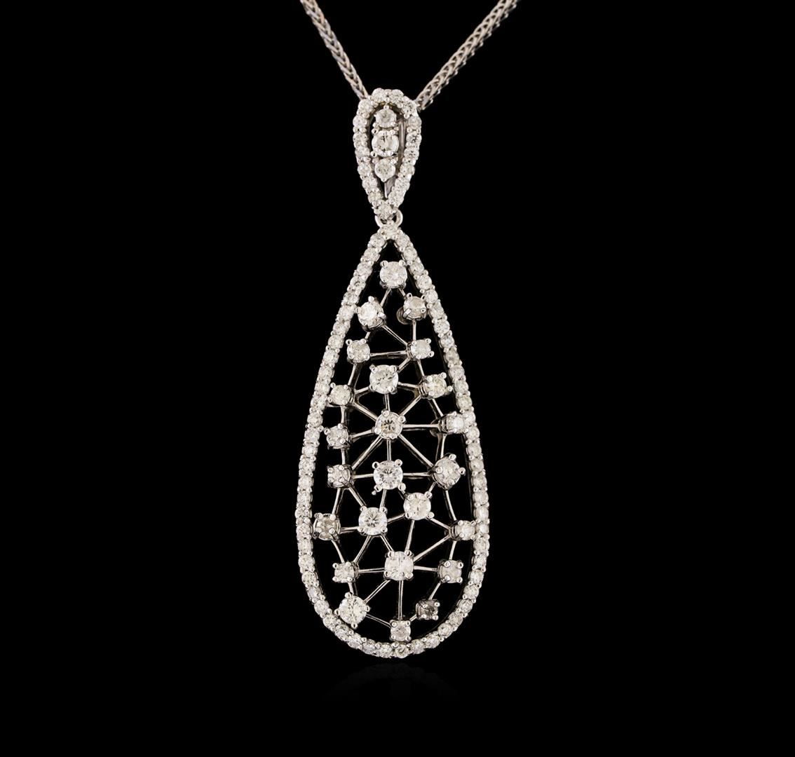 One electronically tested 14KT white gold ladies combination cast & assembled diamond pendant & chain 18.0 long, medium cable link with a lobster claw clasp with a bright polish finish. Identified with markings of 14K. Condition is new. Containing: One Hundred Five prong set round brilliant cut diamonds, measuring 2.20 - 1.10 x 0.99mm (depth est.) approximate total weight of 105 Stones = 1.72ct. Clarity: SI-2 to I-2. Color: I - J, Cut is Good. All diamonds are graded in the mounting, unless otherwise stated. Total Weight of Diamonds 1.72ct. Total Weight of Pendant & Chain 8.30 grams. GGL Appraised.