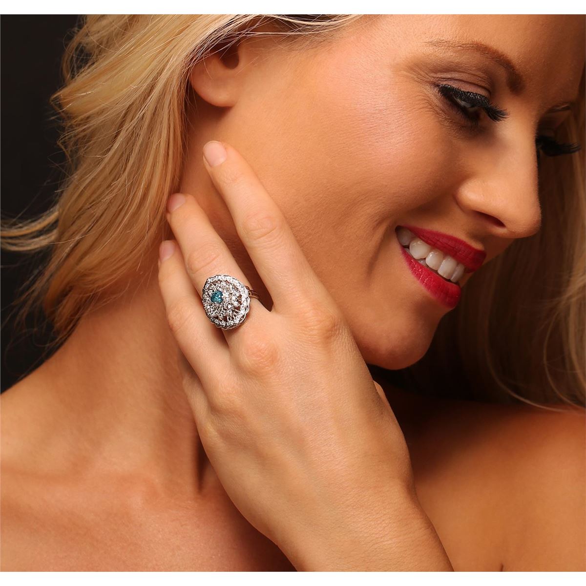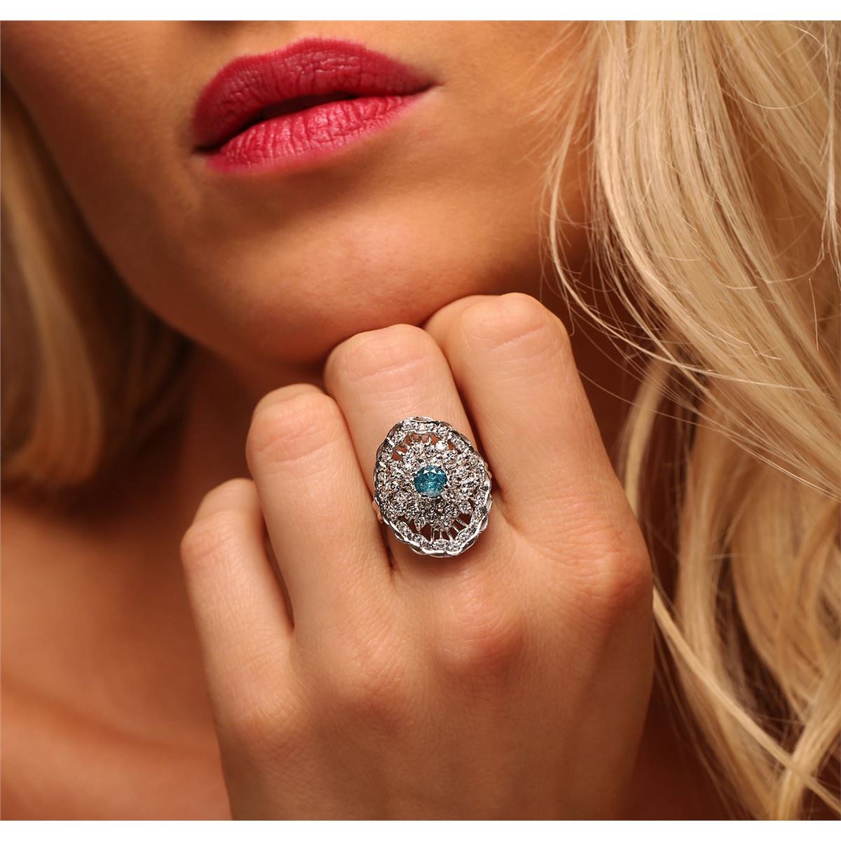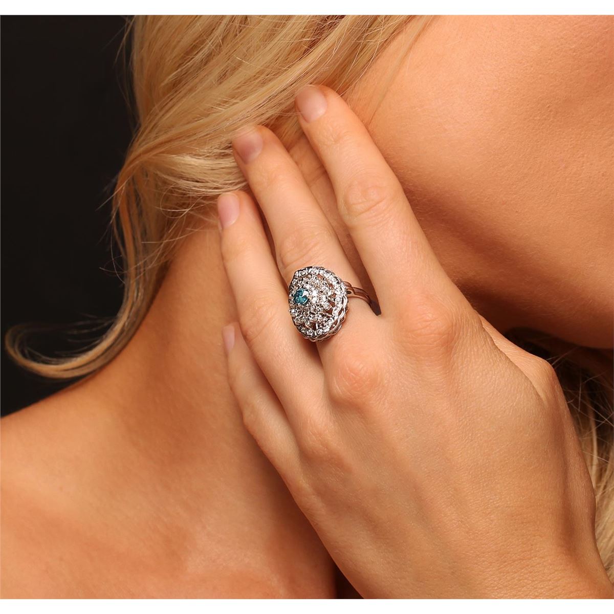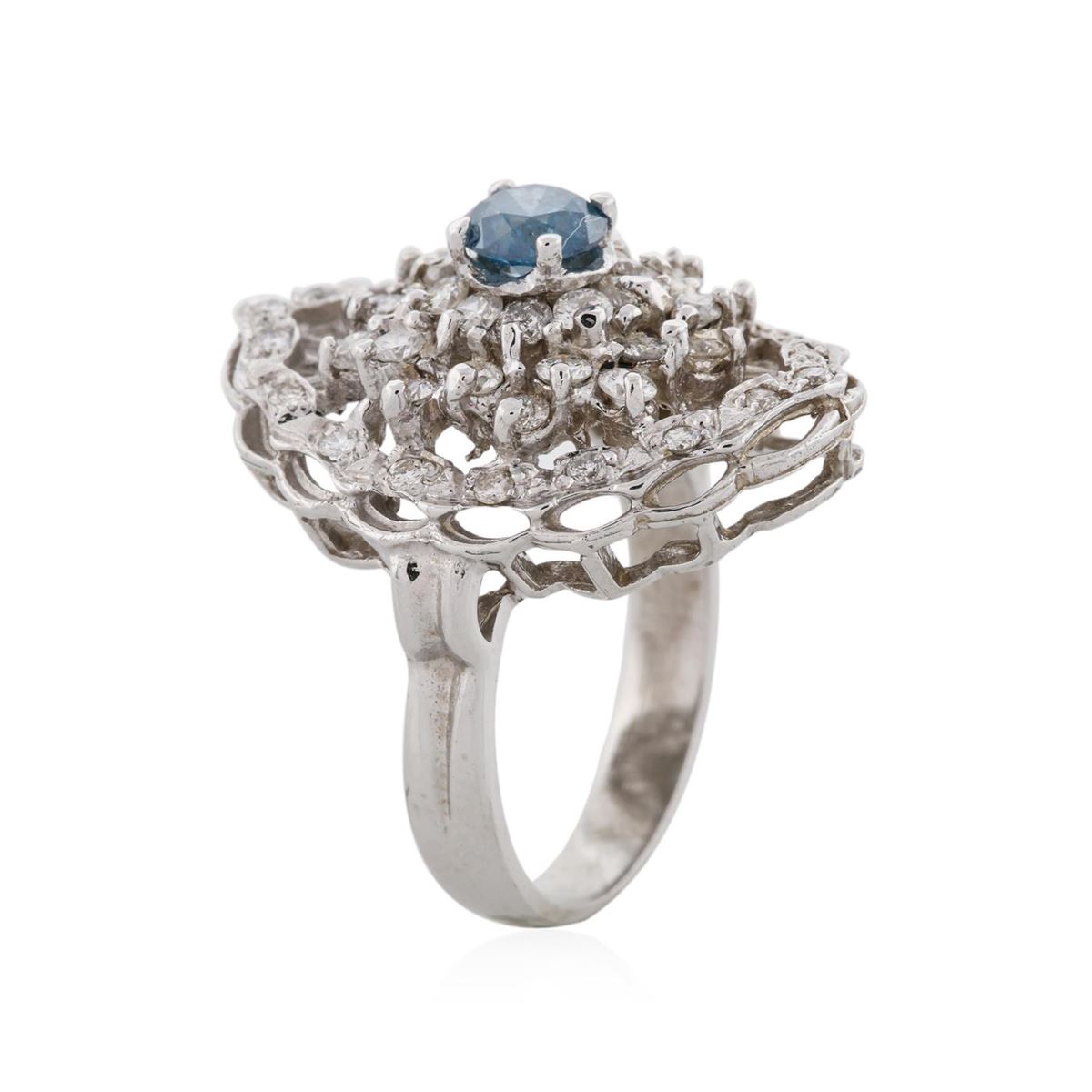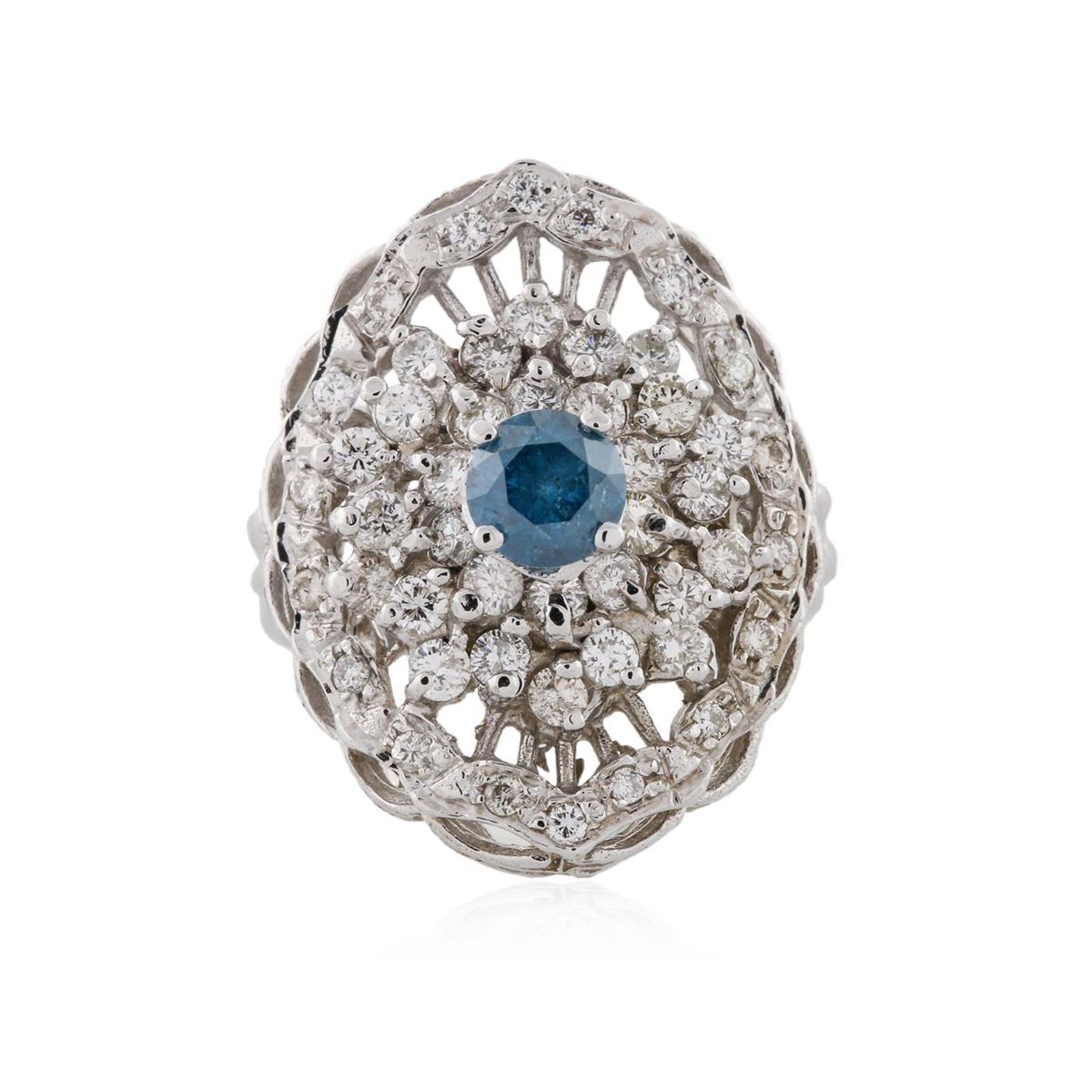 One electronically tested 14KT white gold ladies cast diamond ring with a bright polish finish. Condition is new, good workmanship. The featured diamond is set within a diamond bouquet, supported by split shoulders and completed by a three millimeter wide band. Identified with markings of "K14". Containing: One prong set round brilliant cut diamond, measuring 5.20 - 5.15 x 3.40mm (depth est.) approximate weight of 0.60ct. Indications of laboratory irradiated enhanced color. Graded in the setting. Clarity: I-2. Depth: 65.6%. Table 56.0%. Thirty prong set round brilliant cut diamonds, measuring 2.10 - 2.00 x 1.23mm (depth est.) approximate. Total Weight of 30 Stones = 0.94ct. Graded in the setting. Clarity: SI-1 to SI-2. Color: G - I Eighteen prong set round brilliant cut diamonds, measuring 1.40 - 1.40 x 0.84mm (depth est.) approximate. Total Weight of 18 Stones = 0.18ct. Graded in the setting. Clarity: SI-1 to I-1. Color: G - I. Total Weight of Diamonds 1.72ct. Total Weight of Ring 7.40 grams. AIG Appraised at $6,400.00.