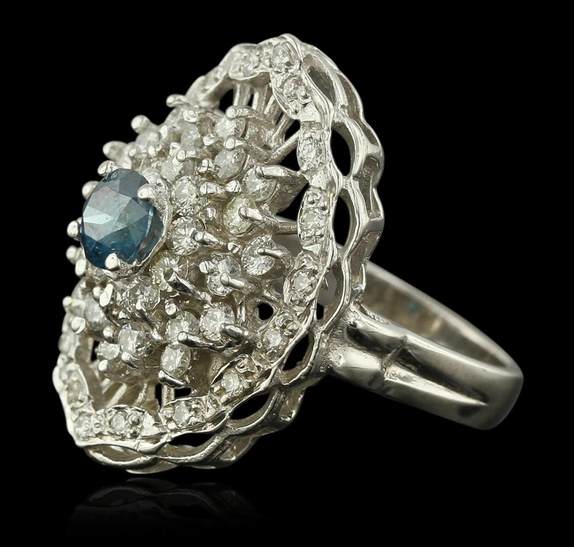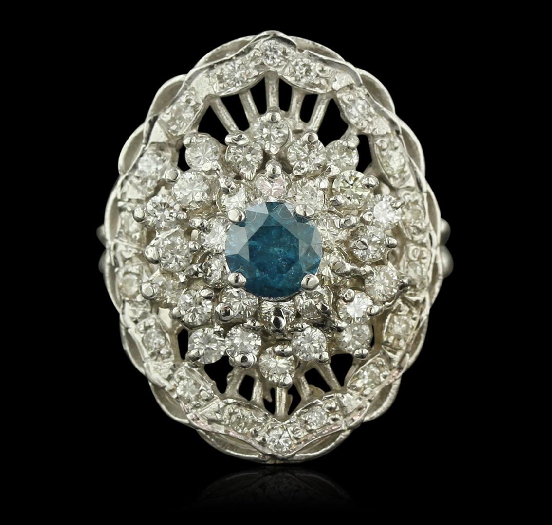 One electronically tested 14KT white gold ladies cast diamond ring with a bright polish finish. Condition is new, good workmanship. The featured diamond is set within a diamond bouquet, supported by split shoulders and completed by a three millimeter wide band. Identified with markings of "K14". Containing: One prong set round brilliant cut diamond, measuring 5.20 - 5.15 x 3.40mm (depth est.) approximate weight of 0.60ct. Indications of laboratory irradiated enhanced color. Graded in the setting. Clarity: I-2. Depth: 65.6%. Table 56.0%. Thirty prong set round brilliant cut diamonds, measuring 2.10 - 2.00 x 1.23mm (depth est.) approximate. Total Weight of 30 Stones = 0.94ct. Graded in the setting. Clarity: SI-1 to SI-2. Color: G - I Eighteen prong set round brilliant cut diamonds, measuring 1.40 - 1.40 x 0.84mm (depth est.) approximate. Total Weight of 18 Stones = 0.18ct. Graded in the setting. Clarity: SI-1 to I-1. Color: G - I. Total Weight of Diamonds 1.72ct. Total Weight of Ring 7.40 grams. AIG Appraised at $6,400.00.