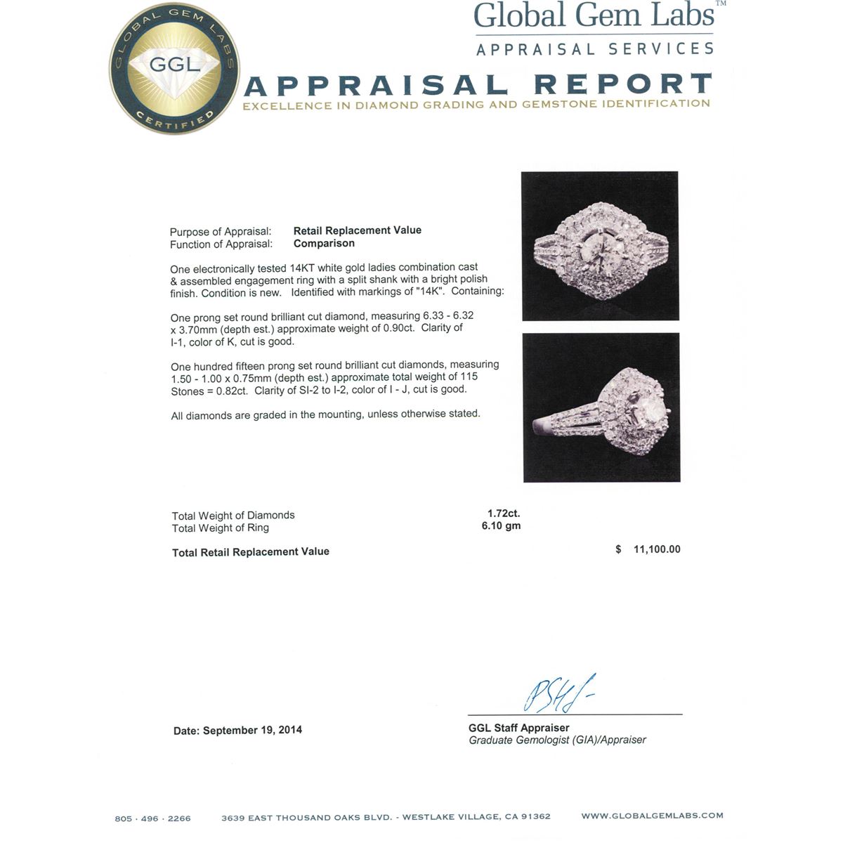 One electronically tested 14KT white gold ladies combination cast & assembled engagement ring with a split shank with a bright polish finish. Identified with markings of "14K". Condition is new. Containing: One prong set round brilliant cut diamond, measuring 6.33 - 6.32 x 3.70mm (depth est.) approximate weight of 0.90ct. Clarity: I-1. Color: K, Cut is Good. One Hundred Fifteen prong set round brilliant cut diamonds, measuring 1.50 - 1.00 x 0.75mm (depth est.) approximate total weight of 115 Stones = 0.82ct. Clarity: SI-2 to I-2. Color: I - J, Cut is Good. All diamonds are graded in the mounting, unless otherwise stated. Total Weight of Diamonds 1.72ct. Total Weight of Ring 6.10 grams. GGL Appraised at $11,100.00.