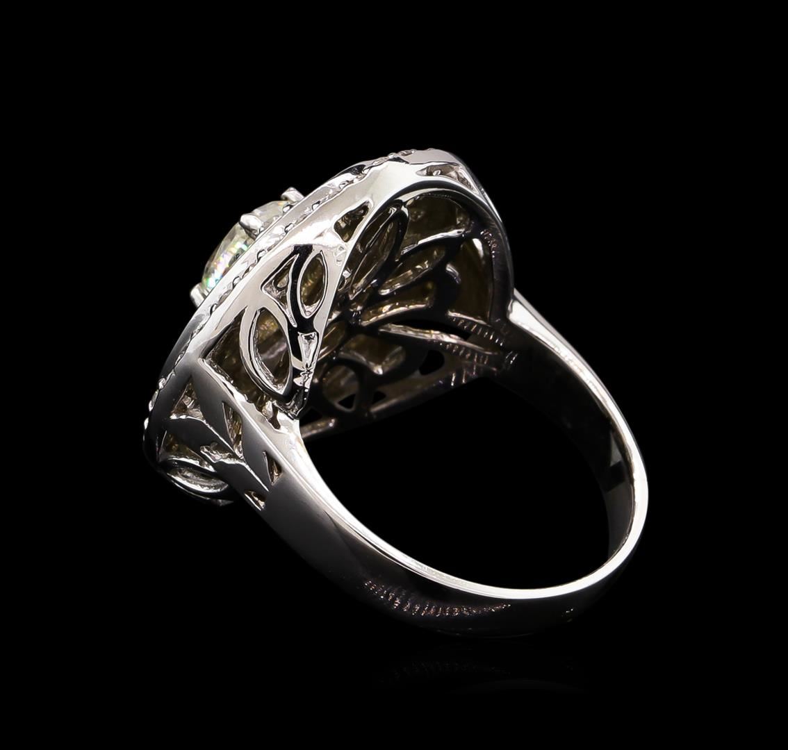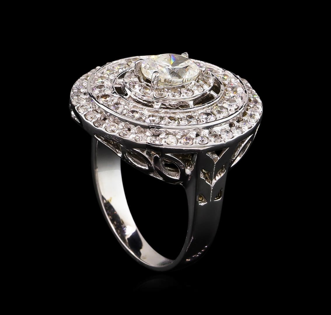 One electronically tested 14KT white gold Ladies engagement ring with a bright polish finish. Condition is new. Identified with markings of "14K". Containing: One prong set oval shaped cut diamond, measuring 6.30 x 5.10 x 3.21mm (depth est.) approximate weight of 0.65ct. Clarity: I-1. Color: J, Cut is Good. Seventy-Two prong set round brilliant cut diamonds, measuring 1.70 - 1.50 x 0.96mm (depth est.) approximate. Total Weight of 72 Stones = 1.07ct. Clarity: I-1 to I-2. Color: H - I, Cut is Good. Total Weight of Diamonds 1.72ct. Total Weight of Ring 6.40 grams. GGL Appraised at $7,050.00.