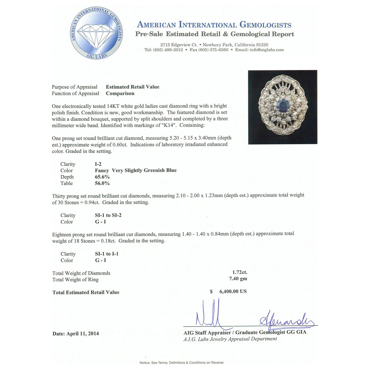 One electronically tested 14KT white gold ladies cast diamond ring with a bright polish finish. Condition is new, good workmanship. The featured diamond is set within a diamond bouquet, supported by split shoulders and completed by a three millimeter wide band. Identified with markings of "K14". Containing: One prong set round brilliant cut diamond, measuring 5.20 - 5.15 x 3.40mm (depth est.) approximate weight of 0.60ct. Indications of laboratory irradiated enhanced color. Graded in the setting. Clarity: I-2. Depth: 65.6%. Table 56.0%. Thirty prong set round brilliant cut diamonds, measuring 2.10 - 2.00 x 1.23mm (depth est.) approximate. Total Weight of 30 Stones = 0.94ct. Graded in the setting. Clarity: SI-1 to SI-2. Color: G - I Eighteen prong set round brilliant cut diamonds, measuring 1.40 - 1.40 x 0.84mm (depth est.) approximate. Total Weight of 18 Stones = 0.18ct. Graded in the setting. Clarity: SI-1 to I-1. Color: G - I. Total Weight of Diamonds 1.72ct. Total Weight of Ring 7.40 grams. AIG Appraised at $6,400.00.