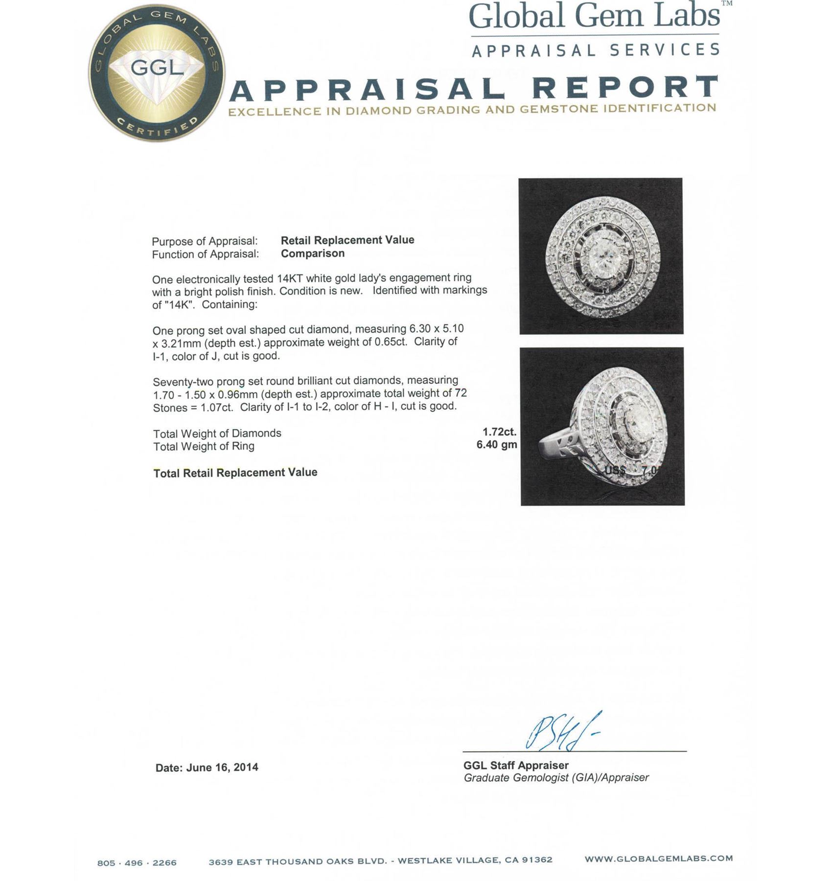 One electronically tested 14KT white gold Ladies engagement ring with a bright polish finish. Condition is new. Identified with markings of "14K". Containing: One prong set oval shaped cut diamond, measuring 6.30 x 5.10 x 3.21mm (depth est.) approximate weight of 0.65ct. Clarity: I-1. Color: J, Cut is Good. Seventy-Two prong set round brilliant cut diamonds, measuring 1.70 - 1.50 x 0.96mm (depth est.) approximate. Total Weight of 72 Stones = 1.07ct. Clarity: I-1 to I-2. Color: H - I, Cut is Good. Total Weight of Diamonds 1.72ct. Total Weight of Ring 6.40 grams. GGL Appraised at $7,050.00.