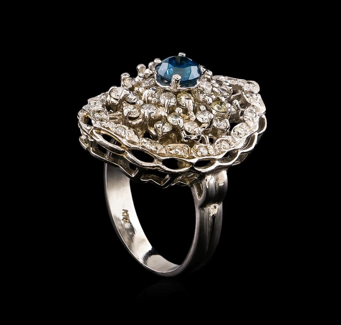 One electronically tested 14KT white gold ladies cast diamond ring with a bright polish finish. Condition is new, good workmanship. The featured diamond is set within a diamond bouquet, supported by split shoulders and completed by a three millimeter wide band. Identified with markings of "K14". Containing: One prong set round brilliant cut diamond, measuring 5.20 - 5.15 x 3.40mm (depth est.) approximate weight of 0.60ct. Indications of laboratory irradiated enhanced color. Graded in the setting. Clarity: I-2. Depth: 65.6%. Table 56.0%. Thirty prong set round brilliant cut diamonds, measuring 2.10 - 2.00 x 1.23mm (depth est.) approximate. Total Weight of 30 Stones = 0.94ct. Graded in the setting. Clarity: SI-1 to SI-2. Color: G - I Eighteen prong set round brilliant cut diamonds, measuring 1.40 - 1.40 x 0.84mm (depth est.) approximate. Total Weight of 18 Stones = 0.18ct. Graded in the setting. Clarity: SI-1 to I-1. Color: G - I. Total Weight of Diamonds 1.72ct. Total Weight of Ring 7.40 grams. AIG Appraised at $6,400.00.