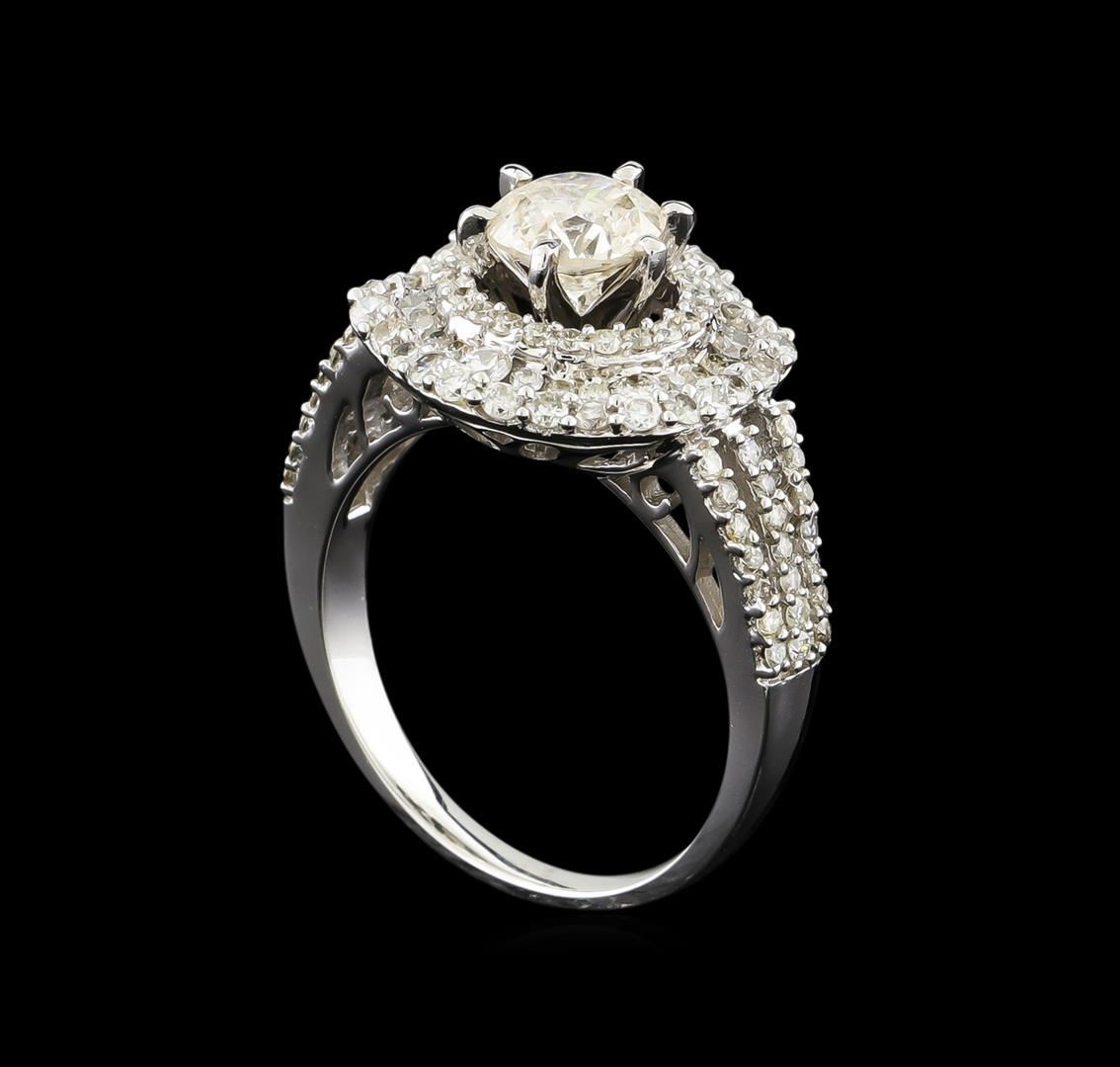 One electronically tested 14KT white gold ladies combination cast & assembled engagement ring with a split shank with a bright polish finish. Identified with markings of "14K". Condition is new. Containing: One prong set round brilliant cut diamond, measuring 6.33 - 6.32 x 3.70mm (depth est.) approximate weight of 0.90ct. Clarity: I-1. Color: K, Cut is Good. One Hundred Fifteen prong set round brilliant cut diamonds, measuring 1.50 - 1.00 x 0.75mm (depth est.) approximate total weight of 115 Stones = 0.82ct. Clarity: SI-2 to I-2. Color: I - J, Cut is Good. All diamonds are graded in the mounting, unless otherwise stated. Total Weight of Diamonds 1.72ct. Total Weight of Ring 6.10 grams. GGL Appraised at $11,100.00.