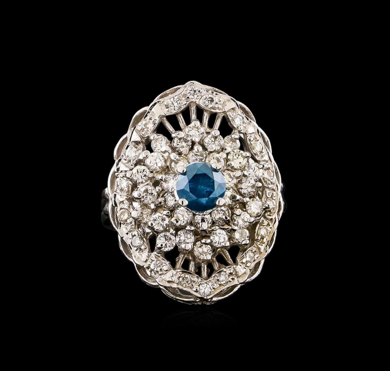 One electronically tested 14KT white gold ladies cast diamond ring with a bright polish finish. Condition is new, good workmanship. The featured diamond is set within a diamond bouquet, supported by split shoulders and completed by a three millimeter wide band. Identified with markings of "K14". Containing: One prong set round brilliant cut diamond, measuring 5.20 - 5.15 x 3.40mm (depth est.) approximate weight of 0.60 ct. Indications of laboratory irradiated enhanced color. Graded in the setting. Clarity: I-2. Depth: 65.6%. Table 56.0%. Thirty prong set round brilliant cut diamonds, measuring 2.10 - 2.00 x 1.23mm (depth est.) approximate. Total Weight of 30 Stones = 0.94ct. Graded in the setting. Clarity: SI-1 to SI-2. Color: G - I Eighteen prong set round brilliant cut diamonds, measuring 1.40 - 1.40 x 0.84mm (depth est.) approximate. Total Weight of 18 Stones = 0.18ct. Graded in the setting. Clarity: SI-1 to I-1. Color: G - I. Total Weight of Diamonds 1.72ct. Total Weight of Ring 7.40 grams. AIG Appraised.