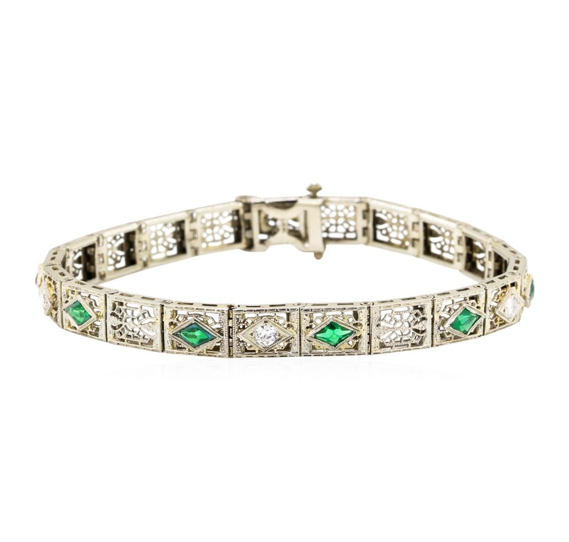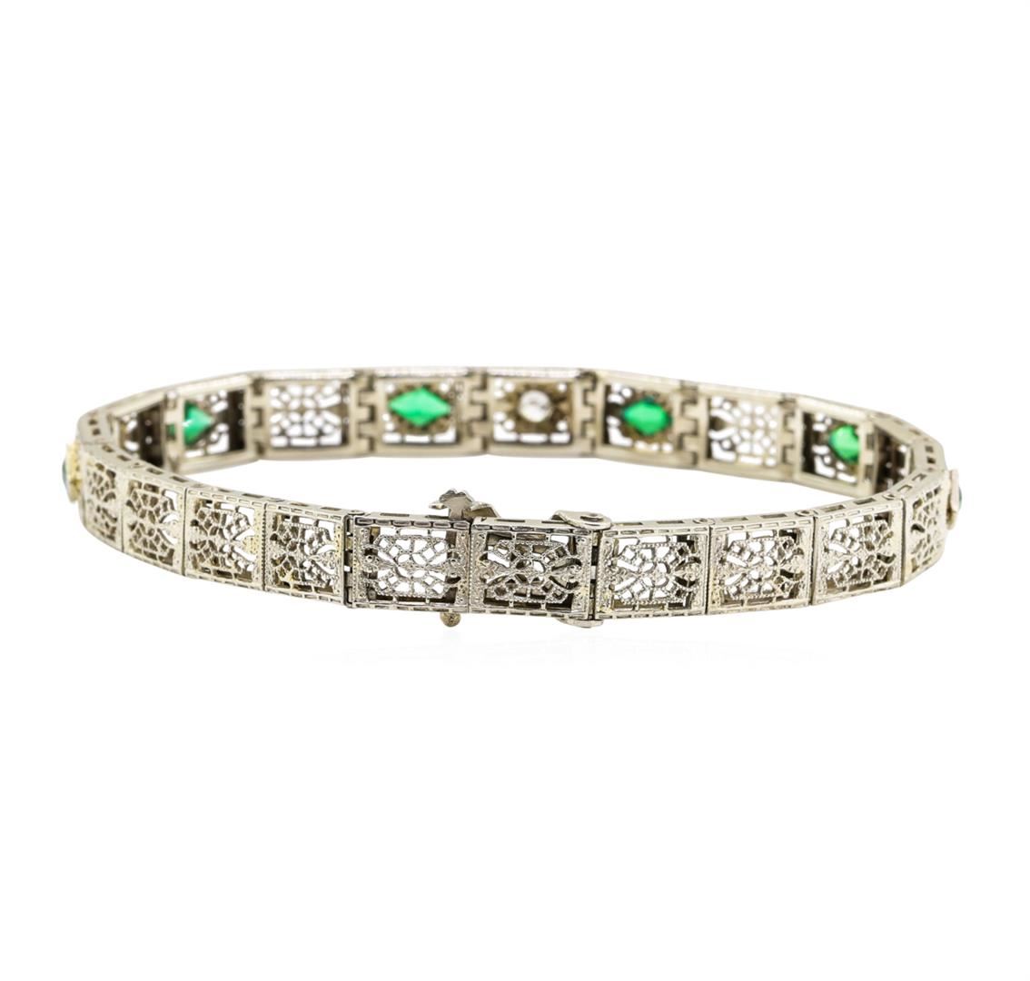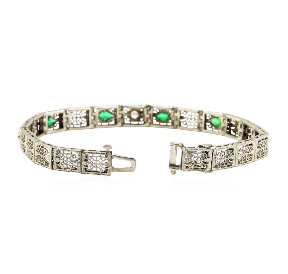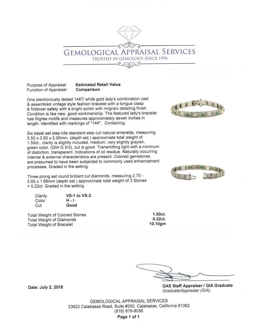 One electronically tested 14KT white gold lady's combination cast & assembled vintage style fashion bracelet with a tongue clasp & foldover safety with a bright polish with milgrain detailing finish. The featured lady's bracelet has filigree motifs and measures approximately seven inches in length. Identified with markings of '14K'. Condition is like new, good workmanship. Containing: Six bezel set step kite standard step cut natural emeralds, measuring 5.50 x 3.50 x 2.00mm, (depth est.) approximate total weight of 1.50ct., clarity is slightly included, medium, very slightly grayish, green color, (GIA G 5/3), cut is good. Transmitting light with a minimum of distortion, transparent. Indications of oil residue. Naturally occurring internal & external characteristics are present. Colored gemstones are presumed to have been subjected to commonly used enhancement processes. Graded in the setting. Three prong set round brilliant cut diamonds, measuring 2.70 - 2.65 x 1.66mm (depth est.) approximate total weight of 3 Stones = 0.22ct. Graded in the setting. Color H - I Clarity VS-1 to VS-2 Cut Good. Total Weight of Colored Stones 1.50ct. Total Weight of Diamonds 0.22ct. Total Weight of Bracelet 10.10gm. GAS Appraised.