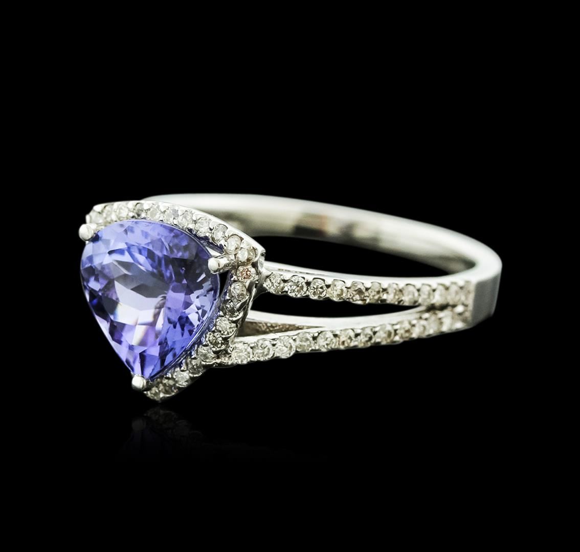 One electronically tested 14KT white gold ladies cast tanzanite and diamond ring with a bright polish finish. Identified with markings of "14K". Condition is new. Containing: One prong set triangle modified brilliant cut natural tanzanite, measuring 7.80 x 7.80 x 4.68mm, approximate weight of 1.72ct., clarity is eye clean, type I, medium light, moderately strong, violet color, (GIA V 4/4), cut is good. Sixty-Six prong set round brilliant cut diamonds, measuring 1.20 - 1.20 x 0.72mm (depth est.) approximate total weight of 66 Stones = 0.42ct. Clarity: SI-2 to I-1. Color: H - I, Cut is Good. Colored gemstones are presumed to have been subjected to commonly used enhancement processes. All diamonds and colored gemstones are graded in the mounting, unless otherwise stated. Total Weight of Colored Stones 1.72ct. Total Weight of Diamonds 0.42ct. Total Weight of Ring 3.00 grams. GGL Appraised at $2,445.00.