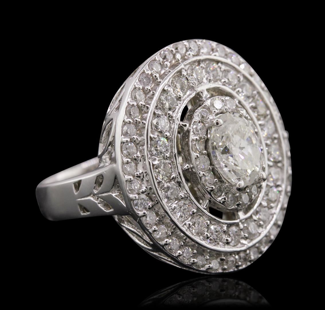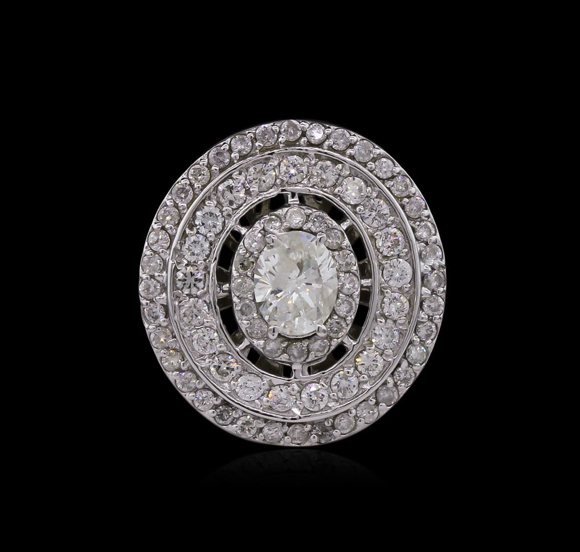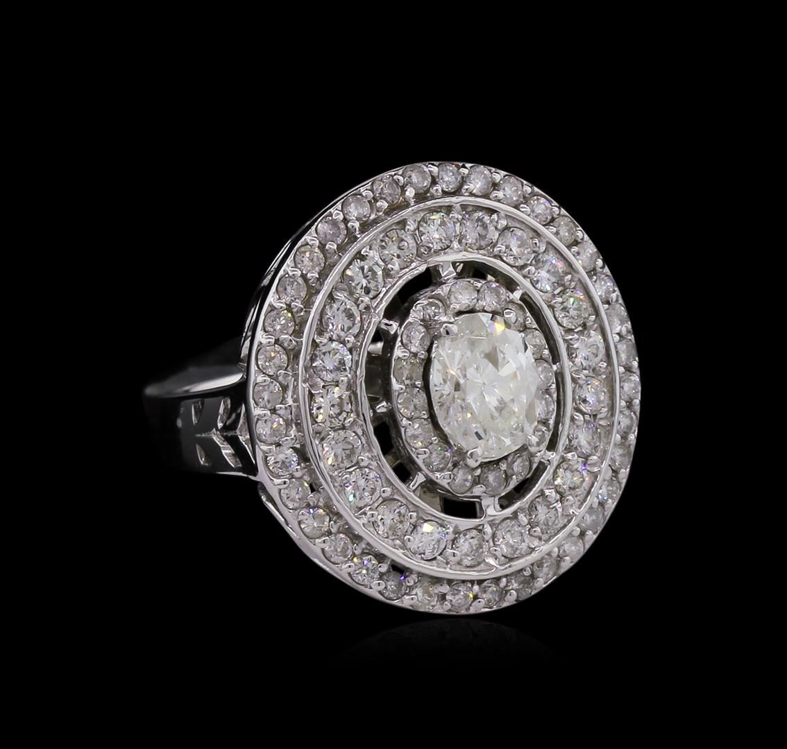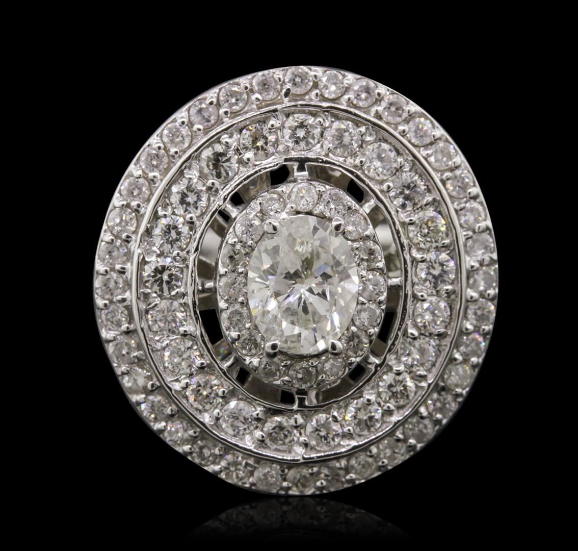 One electronically tested 14KT white gold Ladies engagement ring with a bright polish finish. Condition is new. Identified with markings of "14K". Containing: One prong set oval shaped cut diamond, measuring 6.30 x 5.10 x 3.21mm (depth est.) approximate weight of 0.65ct. Clarity: I-1. Color: J, Cut is Good. Seventy-Two prong set round brilliant cut diamonds, measuring 1.70 - 1.50 x 0.96mm (depth est.) approximate. Total Weight of 72 Stones = 1.07ct. Clarity: I-1 to I-2. Color: H - I, Cut is Good. Total Weight of Diamonds 1.72ct. Total Weight of Ring 6.40 grams. GGL Appraised at $7,050.00.