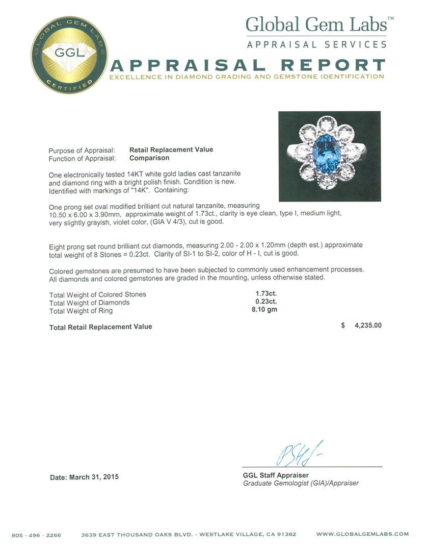 One electronically tested 14KT white gold ladies cast tanzanite and diamond ring with a bright polish finish. Identified with markings of "14K". Condition is new. Containing: One prong set oval modified brilliant cut natural tanzanite, measuring 10.50 x 6.00 x 3.90mm, approximate weight of 1.73ct., clarity is eye clean, type I, medium light, very slightly grayish, violet color, (GIA V 4/3), cut is good. Eight prong set round brilliant cut diamonds, measuring 2.00 - 2.00 x 1.20mm (depth est.) approximate total weight of 8 Stones = 0.23ct. Clarity: SI-1 to SI-2. Color: H - I, Cut is Good. Colored gemstones are presumed to have been subjected to commonly used enhancement processes. All diamonds and colored gemstones are graded in the mounting, unless otherwise stated. Total Weight of Colored Stones 1.73ct. Total Weight of Diamonds 0.23ct. Total Weight of Ring 8.10 grams. GGL Appraised at $4,235.00.