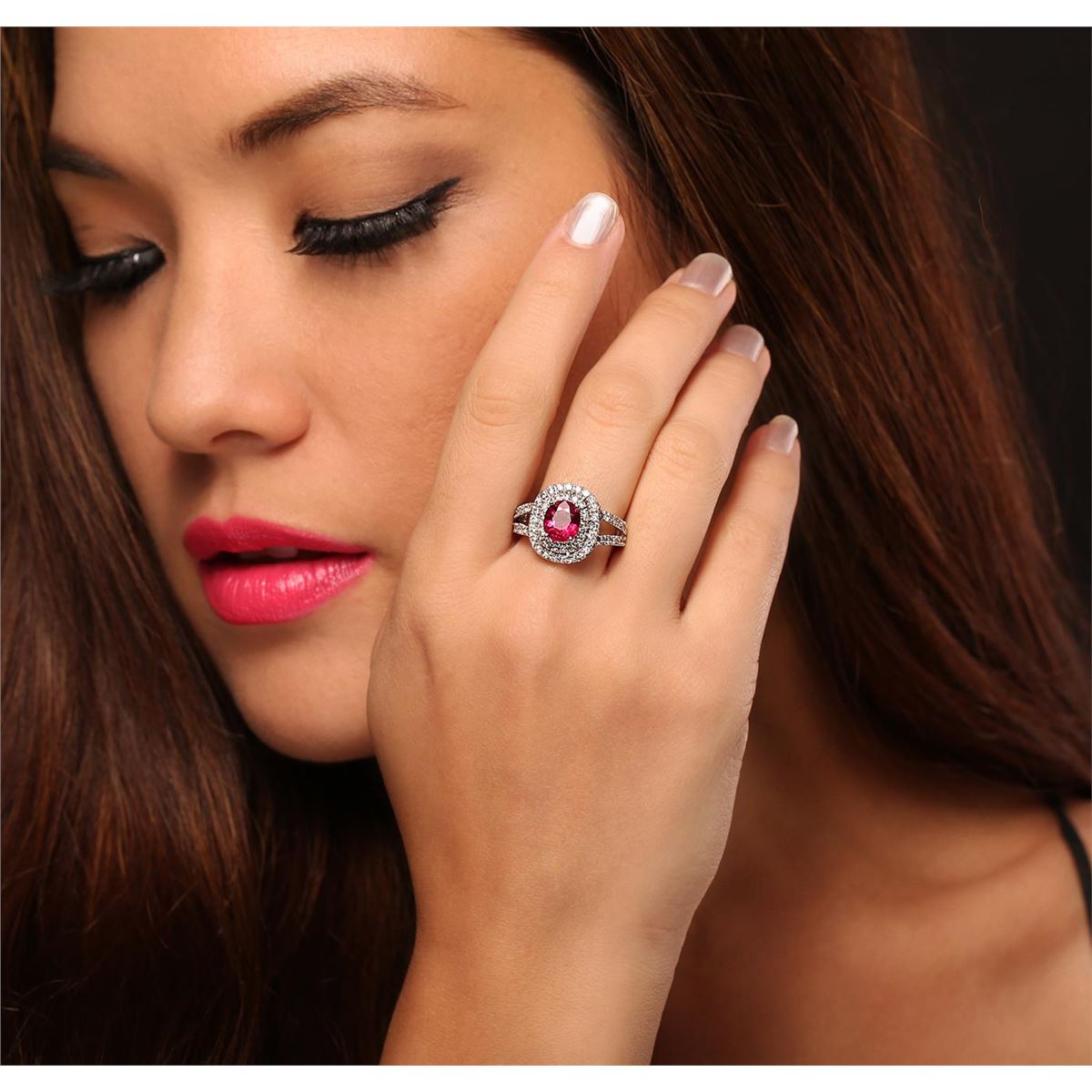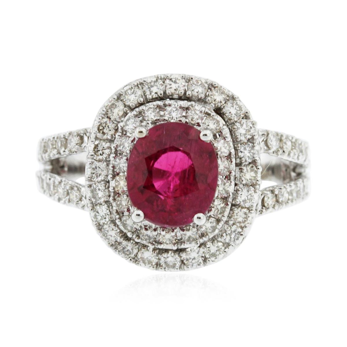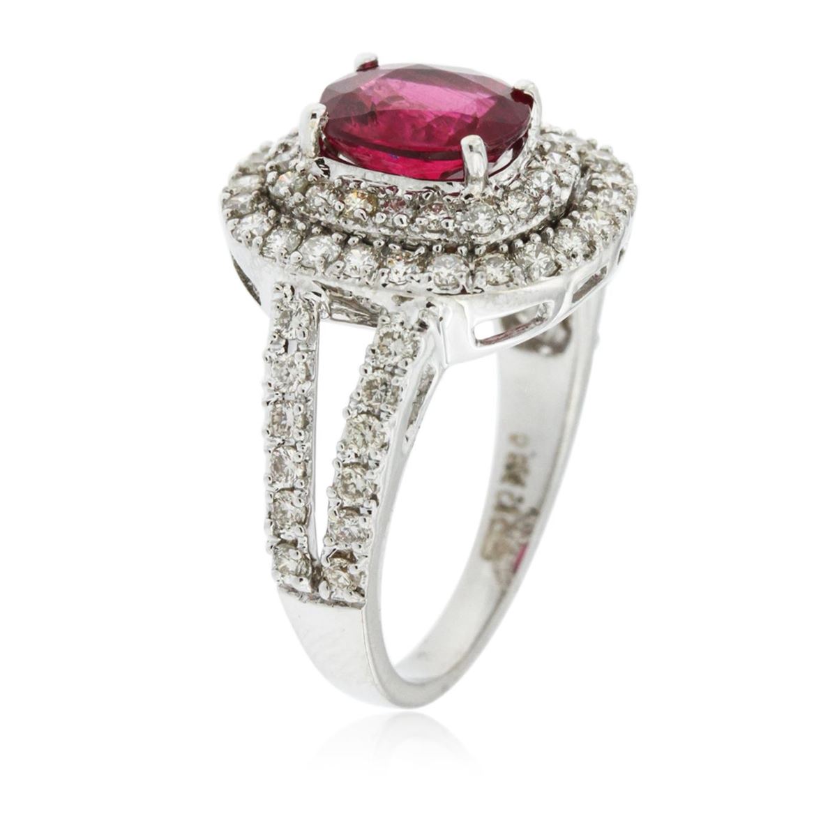 One electronically tested 14KT white gold Ladies combination cast & assembled ring with a bright polish finish. Condition is new. Identified with markings of "14K". Containing: Sixty-Six prong set round brilliant cut diamonds, measuring 1.40 - 1.40 x 0.84mm (depth est.) approximate. Total Weight of 66 Stones = 1.01ct. Clarity: I-1 to I-3. Color: K - L, Cut is Good. One prong set oval modified brilliant cut natural pink tourmaline, measuring 8.00 x 7.00 x 4.70mm, exact weight 1.73ct., clarity is eye clean, type II, medium, moderately strong, reddish purple color, (GIA rP 5/4), cut is very good. Colored gemstones are presumed to have been subjected to commonly used color/clarity enhancement processes. Total Weight of Colored Stones 1.73ct. Total Weight of Diamonds 1.01ct. Total Weight of Ring 5.50 grams. GGL Appraised at $4,580.00.