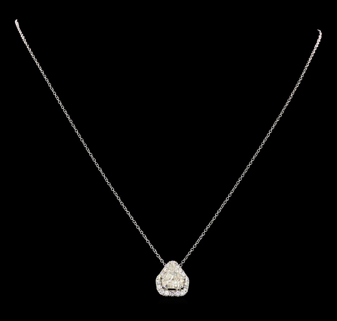 One electronically tested 14KT white gold lady's combination cast & assembled fashion pendant & chain 16.0" long, 1mm round cable link with a spring ring clasp with a bright polish finish. Identified with markings of "14K". Condition is new, good workmanship. Containing: One prong set shield cut diamond, measuring 8.86 x 7.20 x 3.41mm (depth est.) approximate weight of 1.43ct. Graded in the setting. Color I - JClarity I-1 Cut Good Eighteen prong set round brilliant cut diamonds, measuring 1.70 - 1.60 x 1.02mm (depth est.) approximate total weight of 18 Stones = 0.31ct. Graded in the setting. Color G - HClarity VS-1 to SI-1 Cut Very Good. Total Weight of Diamonds 1.74ct. Total Weight of Pendant & Chain 2.70gm. GAS Appraised.