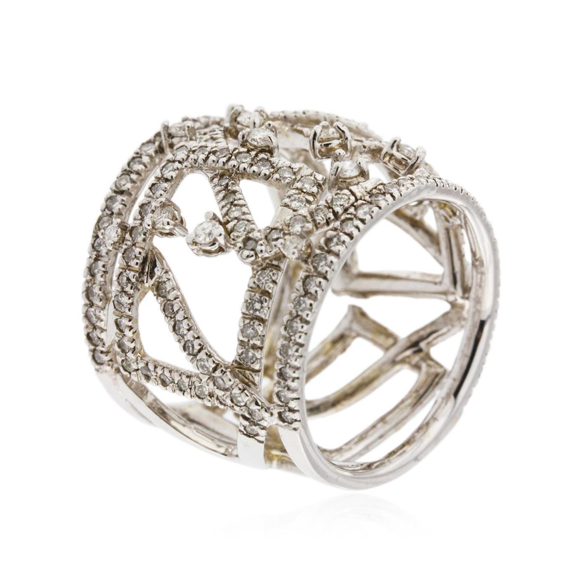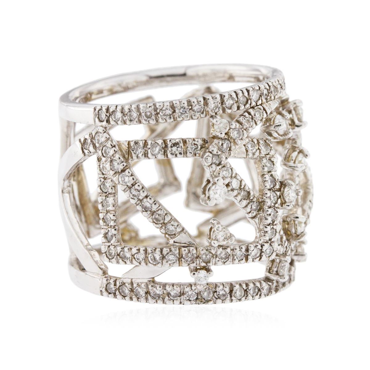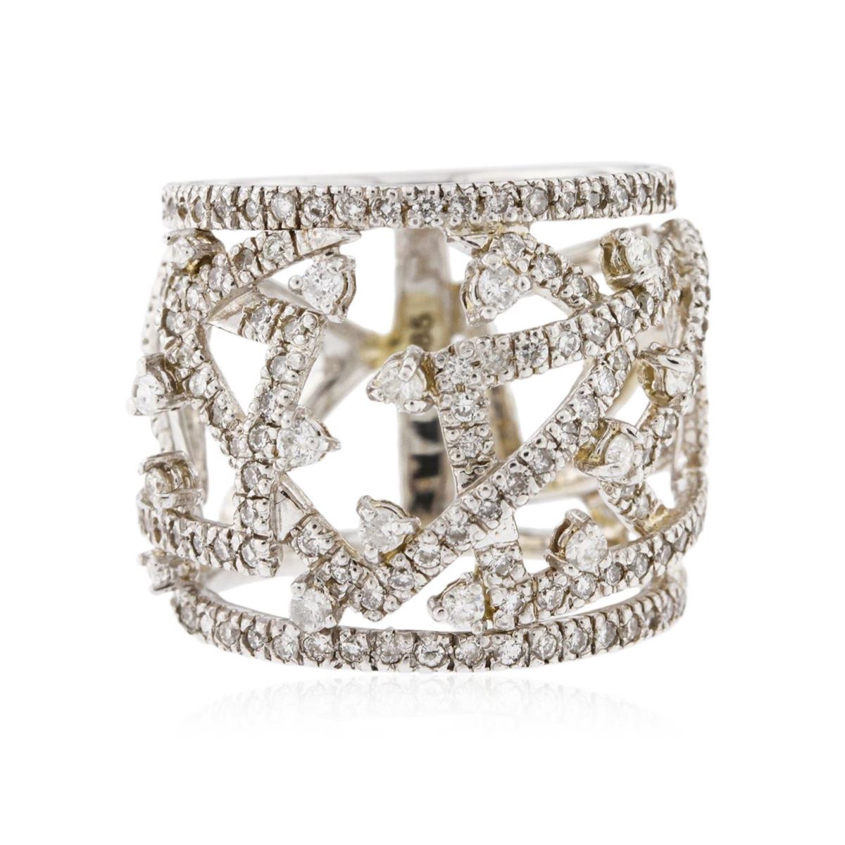 One electronically tested 14KT white gold ladies cast diamond ring with a bright polish finish. Condition is good. The ring features a nineteen millimeter wide intertwining geometric diamond set design, tapering to a seventeen millimeter wide band. Identified with markings of "585". Containing: Fifteen prong set round brilliant cut diamonds, measuring 1.90 - 1.80 x 1.11mm (depth est.) approximate. Total Weight of 15 Stones = 0.45ct. Graded in the setting. Clarity: SI-2 to I-1 . Color: G - I One Hundred Sixty-Eight prong set round brilliant cut diamonds, measuring 1.30 - 1.20 x 0.75mm (depth est.) approximate. Total Weight of 168 Stones = 1.29ct. Graded in the setting. Clarity: SI-1 to I-1 . Color: G - I. Total Weight of Diamonds 1.74ct.. Total Weight of Ring 10.44 grams. AIG Appraised at $7,915.00.