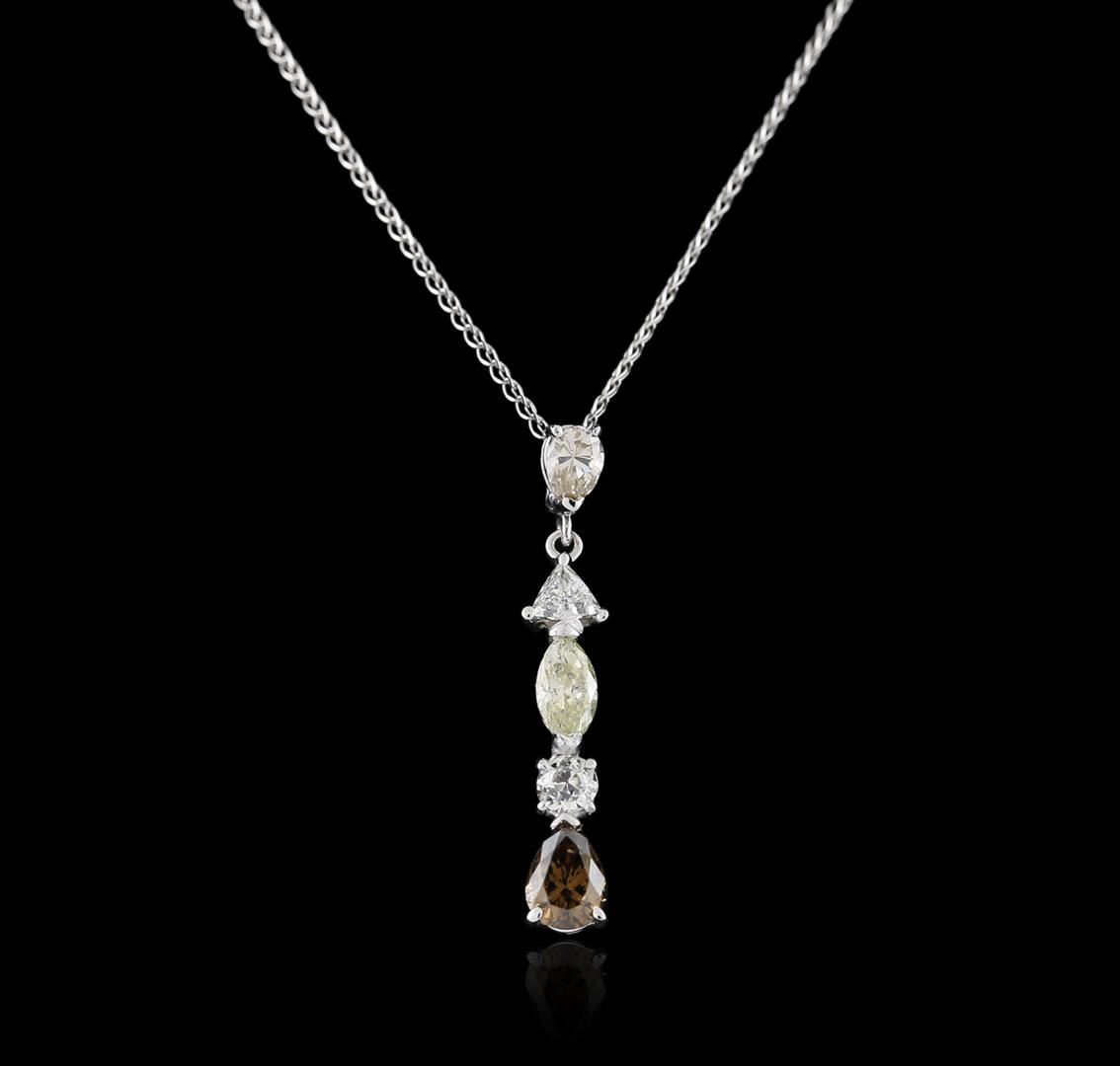 One electronically tested 14KT white gold ladies cast & assembled diamond pendant with chain. The pendant features a diamond ribbon dangle, completed by a diamond set bail. The pendant is supported by an eighteen inch length 14KT white gold designer style chain, terminating in a spring ring clasp. Bright polish finish . Condition is new, good workmanship. Containing: One prong set pear shaped cut fancy brown diamond, measuring 6.60 x 4.80 x 3.35mm (depth est.), 6.00% GTCF approximate weight of 0.70ct. Graded in the setting. Clarity: I-1 One prong set Old European cut diamond, measuring 3.55 - 3.50 x 2.40mm (depth est.), 8.00% GTCF approximate weight of 0.24ct. Cutting style circa late 19th century. Graded in the setting. Clarity: SI-2. Color: J One prong set marquise shaped cut light yellow diamond, measuring 7.00 x 3.70 x 2.55mm (depth est.) approximate weight of 0.40ct. Graded in the setting. Clarity: I-1 One prong set triangle brilliant cut diamond, measuring 4.20 x 4.10 x 1.50mm (depth est.), 6.00% GTCF approximate weight of 0.16ct. Graded in the setting. Clarity: I-1. Color: H One prong set pear shaped cut diamond, measuring 4.70 x 3.60 x 2.30mm (depth est.) approximate weight of 0.24ct. Graded in the setting. Clarity: SI-2. Color: K. Total Weight of Diamonds 1.74ct. AIG Appraised at $5,820.00.