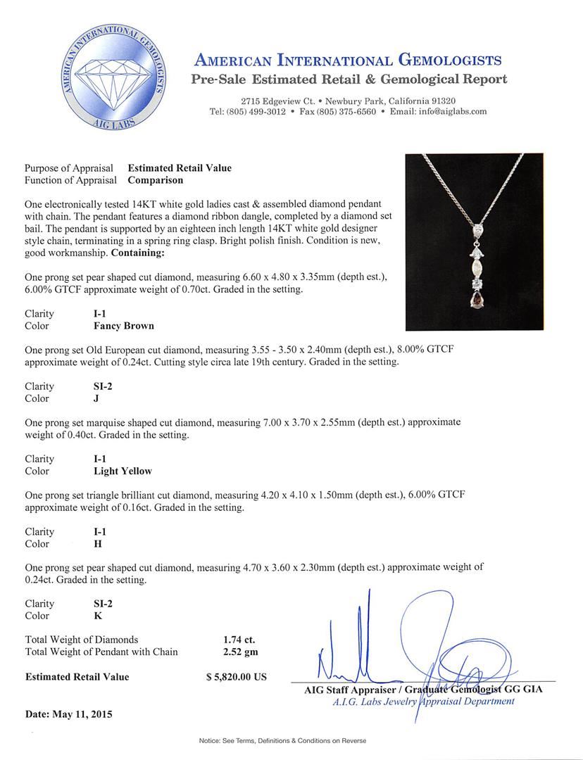 One electronically tested 14KT white gold ladies cast & assembled diamond pendant with chain. The pendant features a diamond ribbon dangle, completed by a diamond set bail. The pendant is supported by an eighteen inch length 14KT white gold designer style chain, terminating in a spring ring clasp. Bright polish finish . Condition is new, good workmanship. Containing: One prong set pear shaped cut fancy brown diamond, measuring 6.60 x 4.80 x 3.35mm (depth est.), 6.00% GTCF approximate weight of 0.70ct. Graded in the setting. Clarity: I-1 One prong set Old European cut diamond, measuring 3.55 - 3.50 x 2.40mm (depth est.), 8.00% GTCF approximate weight of 0.24ct. Cutting style circa late 19th century. Graded in the setting. Clarity: SI-2. Color: J One prong set marquise shaped cut light yellow diamond, measuring 7.00 x 3.70 x 2.55mm (depth est.) approximate weight of 0.40ct. Graded in the setting. Clarity: I-1 One prong set triangle brilliant cut diamond, measuring 4.20 x 4.10 x 1.50mm (depth est.), 6.00% GTCF approximate weight of 0.16ct. Graded in the setting. Clarity: I-1. Color: H One prong set pear shaped cut diamond, measuring 4.70 x 3.60 x 2.30mm (depth est.) approximate weight of 0.24ct. Graded in the setting. Clarity: SI-2. Color: K. Total Weight of Diamonds 1.74ct. AIG Appraised at $5,820.00.