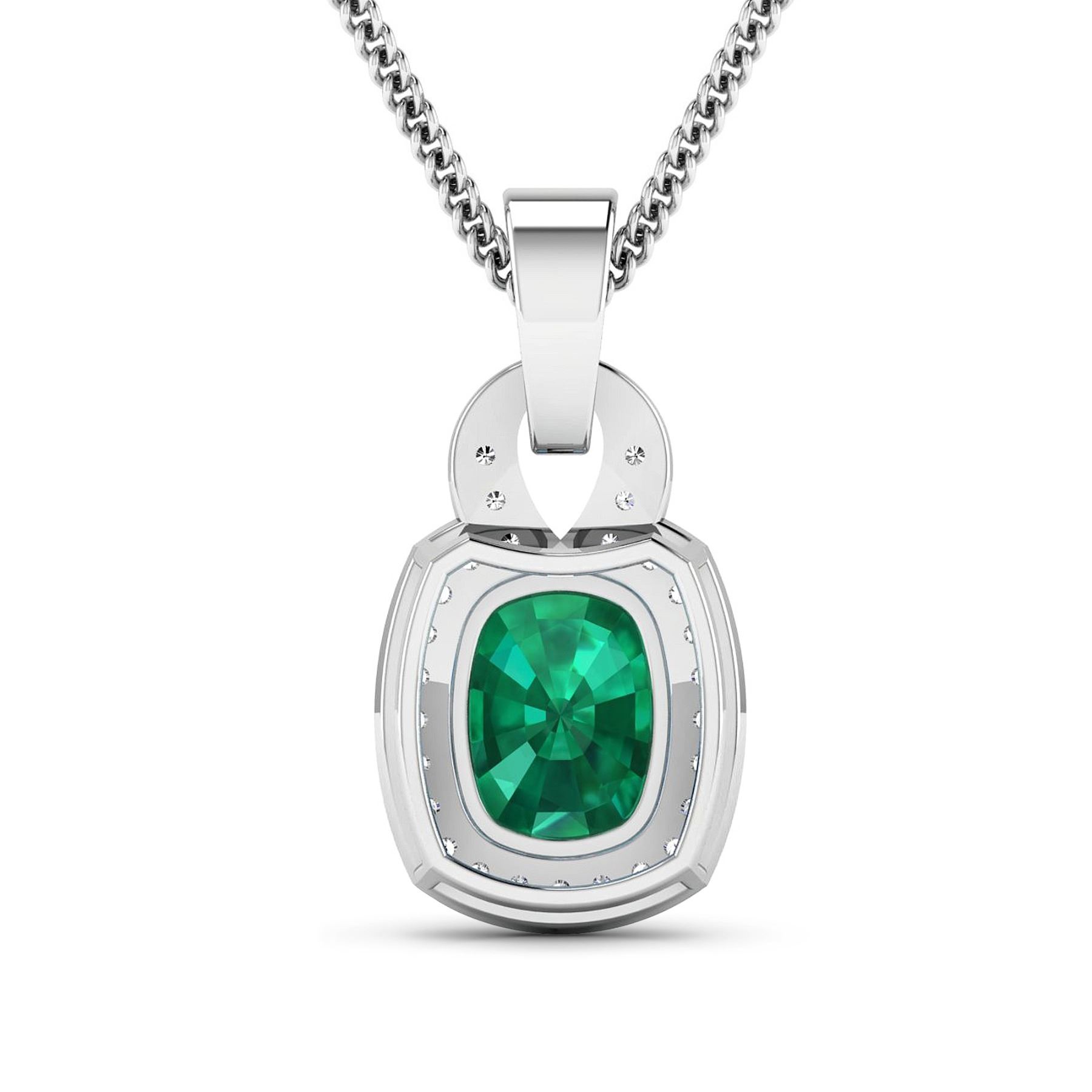 Zambian Emerald (AA) Cushion 9x7mm - 1Pc + White Diamond F/C Round 1.20mm - 31Pcs ( SI2/HI color ) Total weight of gemstone is 1.74cts. Total Diamond weight is 0.25cts. Total weight of this pendant is 2.06 grams.