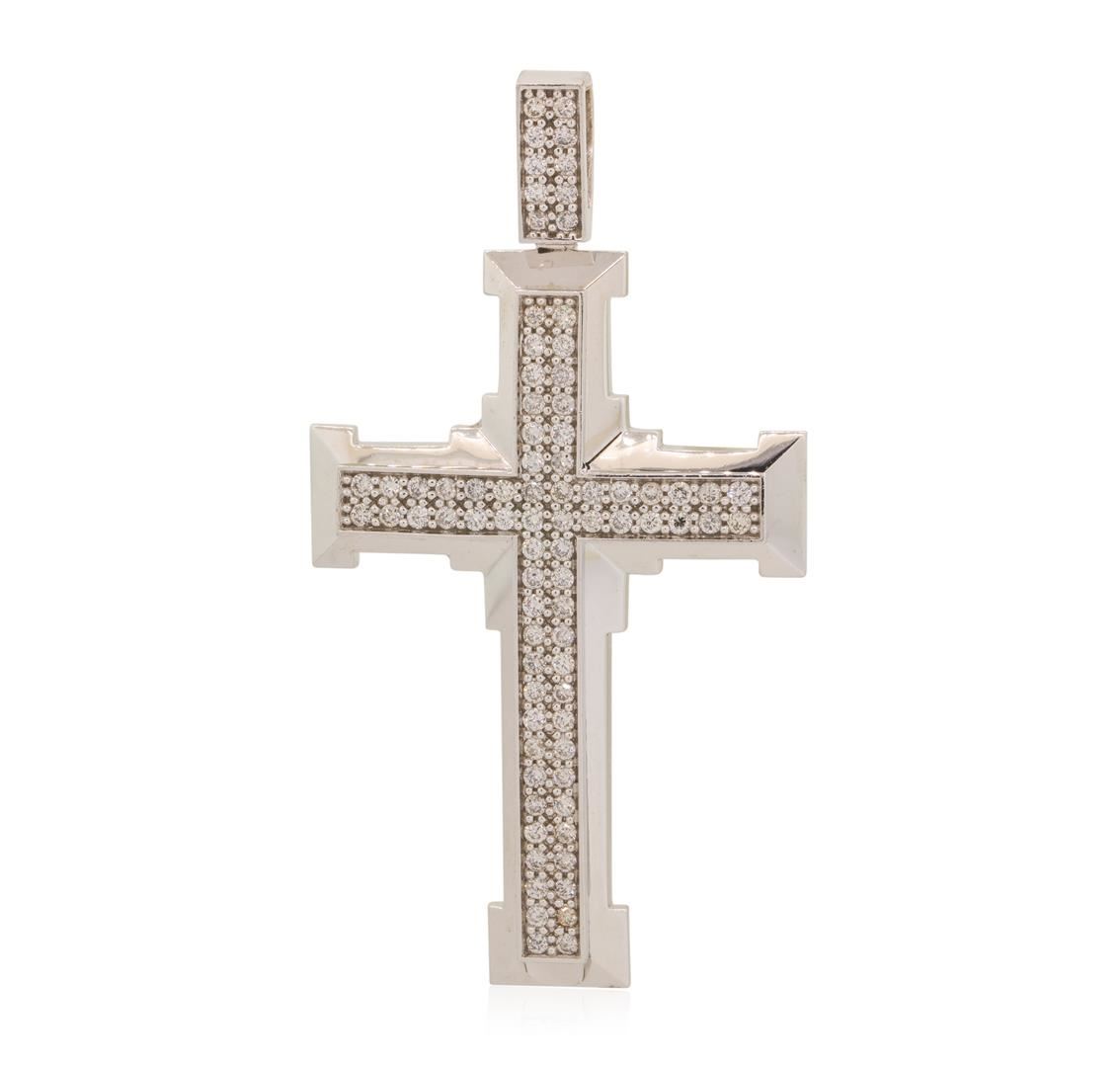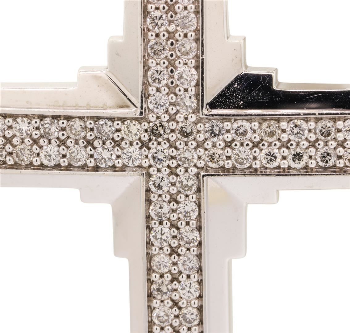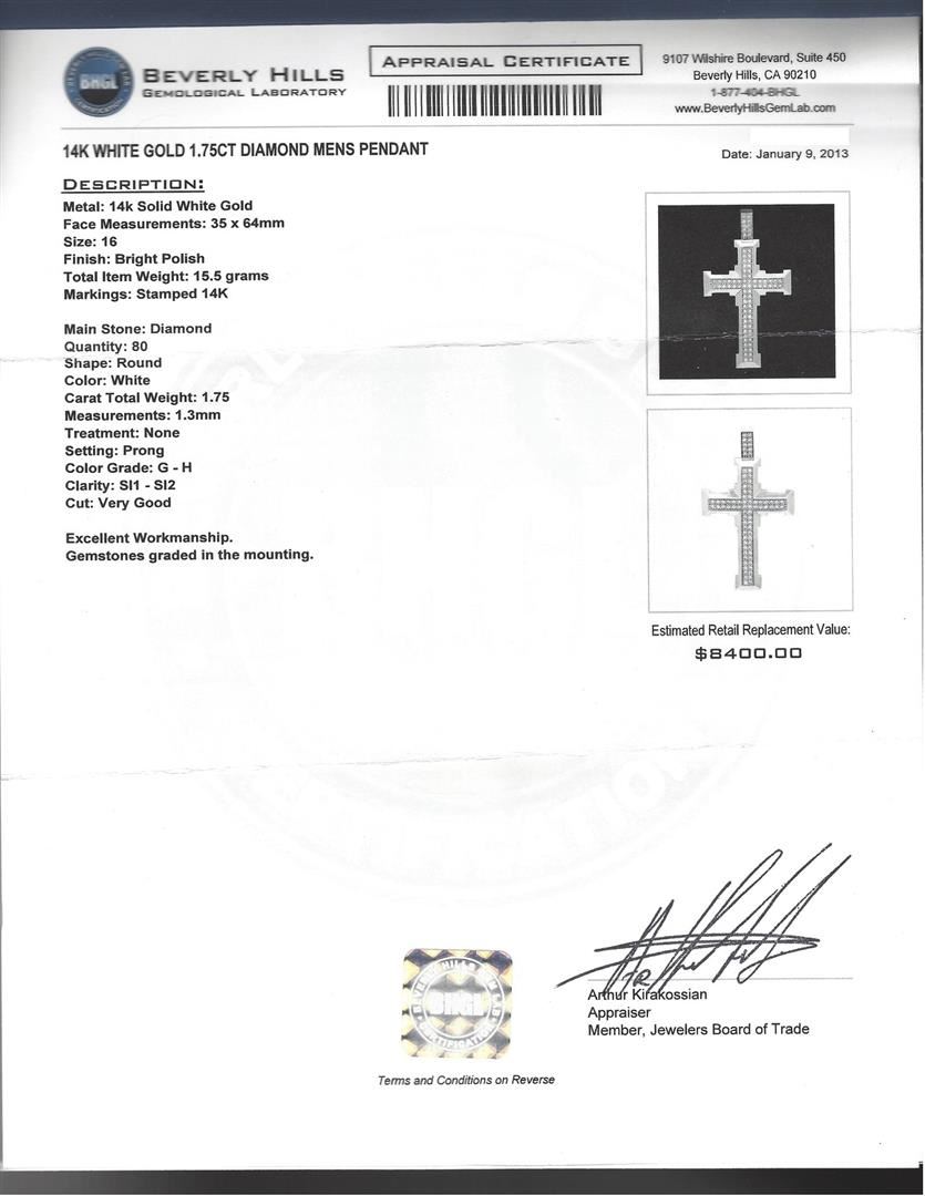 One 14KT solid white gold mens cross pendant with bright polish identified with "14K" marking. Condition is good. Measurements" 35 x 64mm. Total Item Weight: 15.5 grams. Size: 16. Containing: 08 prong set white round cut diamonds 1.75ctw. Measurements: 1.3mm. Color Grade: G - H. Clarity: SI1 - SI2. Cut: Very good. BHGL Appraised at $8,400.00.