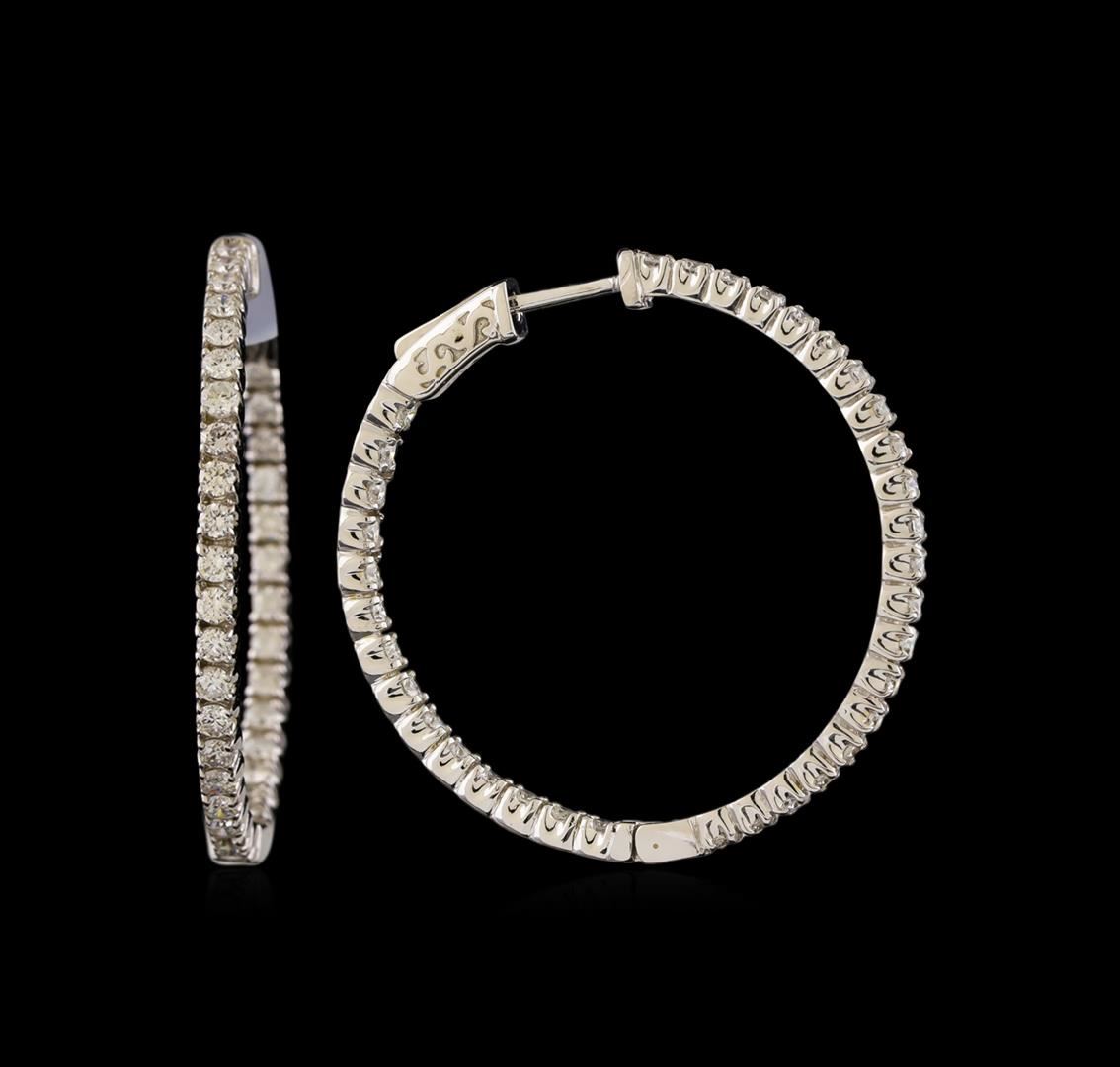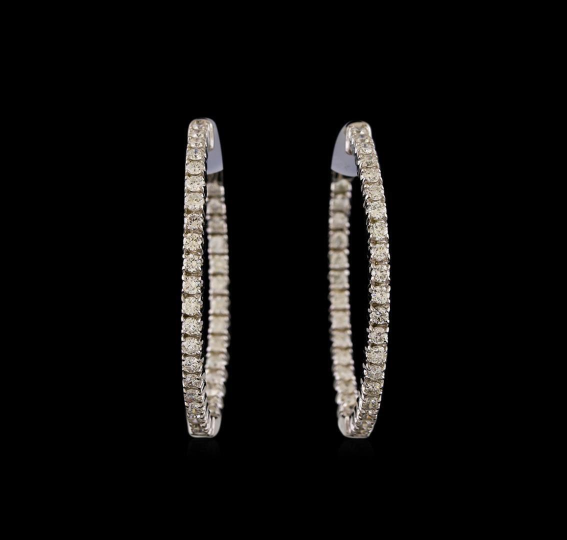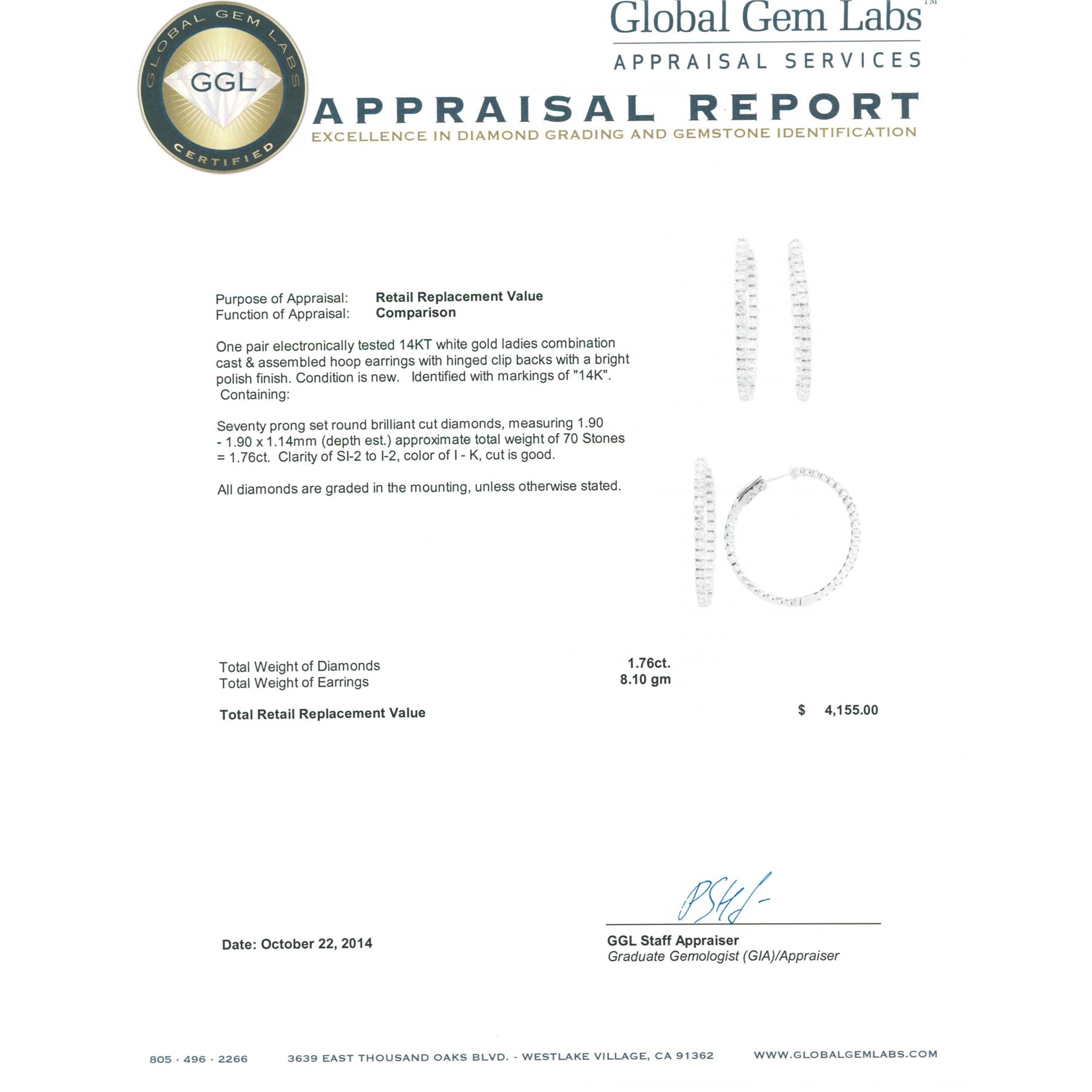 One pair electronically tested 14KT white gold ladies combination cast & assembled hoop earrings with hinged clip backs with a bright polish finish. Identified with markings of "14K". Condition is new. Containing: Seventy prong set round brilliant cut diamonds, measuring 1.90 - 1.90 x 1.14mm (depth est.) approximate total weight of 70 Stones = 1.76ct. Clarity: SI-2 to I-2. Color: I - K, Cut is Good. All diamonds are graded in the mounting, unless otherwise stated. Total Weight of Diamonds 1.76ct. Total Weight of Earrings 8.10 grams. GGL Appraised at $4,155.00.