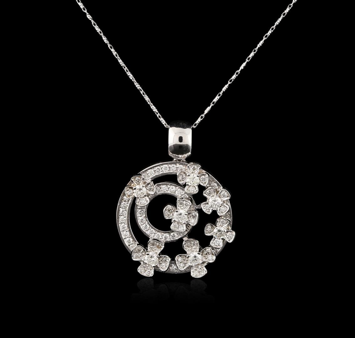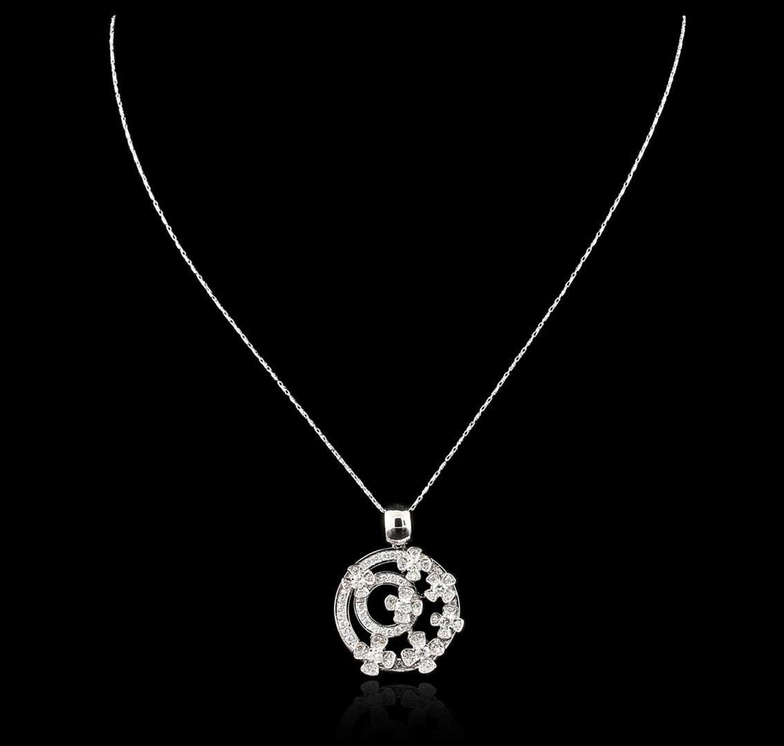 One electronically tested 14KT white gold ladies cast & assembled diamond pendant with chain. The pendant features two diamond set circles with diamond set floral accents, completed by a white gold bail. The pendant is supported by an eighteen inch length 14KT white gold designer style chain, terminating in a lobster claw clasp. Bright polish finish. Identified with markings of "14K". Condition is new, good workmanship. Containing: Seven prong set round brilliant cut diamonds, measuring 3.10 - 3.00 x 1.83mm (depth est.) approximate total weight of 7 Stones = 0.75ct. Graded in the setting. Clarity: SI-2 to I-1. Color: H - J Seventy-Four prong set round brilliant cut diamonds, measuring 1.60 - 1.40 x 0.90mm (depth est.) approximate total weight of 74 Stones = 1.01ct. Graded in the setting. Clarity: SI-1 to I-1. Color: G - I. Total Weight of Diamonds 1.76ct. Total Weight of Pendant With Chain 12.58 grams. AIG Appraised at $7,030.00.