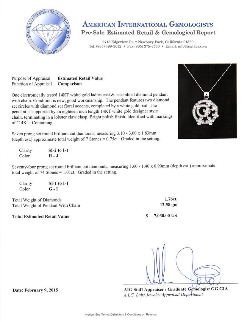 One electronically tested 14KT white gold ladies cast & assembled diamond pendant with chain. The pendant features two diamond set circles with diamond set floral accents, completed by a white gold bail. The pendant is supported by an eighteen inch length 14KT white gold designer style chain, terminating in a lobster claw clasp. Bright polish finish. Identified with markings of "14K". Condition is new, good workmanship. Containing: Seven prong set round brilliant cut diamonds, measuring 3.10 - 3.00 x 1.83mm (depth est.) approximate total weight of 7 Stones = 0.75ct. Graded in the setting. Clarity: SI-2 to I-1. Color: H - J Seventy-Four prong set round brilliant cut diamonds, measuring 1.60 - 1.40 x 0.90mm (depth est.) approximate total weight of 74 Stones = 1.01ct. Graded in the setting. Clarity: SI-1 to I-1. Color: G - I. Total Weight of Diamonds 1.76ct. Total Weight of Pendant With Chain 12.58 grams. AIG Appraised at $7,030.00.