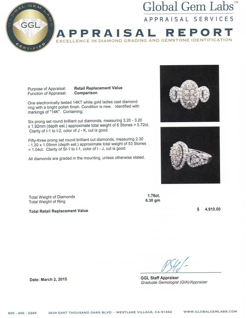 One electronically tested 14KT white gold ladies cast diamond ring with a bright polish finish. Identified with markings of "14K". Condition is new. Containing: Six prong set round brilliant cut diamonds, measuring 3.20 - 3.20 x 1.92mm (depth est.) approximate total weight of 6 Stones = 0.72ct. Clarity: I-1 to I-2. Color: J - K, Cut is Good. Fifty-Three prong set round brilliant cut diamonds, measuring 2.30 - 1.20 x 1.05mm (depth est.) approximate total weight of 53 Stones = 1.04ct. Clarity: SI-1 to I-1. Color: I - J, Cut is Good. All diamonds are graded in the mounting, unless otherwise stated. Total Weight of Diamonds 1.76ct. Total Weight of Ring 6.30 grams. GGL Appraised at $4,910.00.