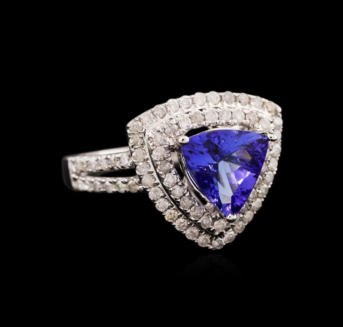 One electronically tested 14KT white gold ladies cast tanzanite and diamond ring with a bright polish finish. Identified with markings of "14K". Condition is new. Containing: One prong set triangle modified brilliant cut natural tanzanite, measuring 7.84 x 7.95 x 4.68mm, approximate weight of 1.76ct., clarity is eye clean, type I, medium light, very slightly grayish, violet color, (GIA V 4/3), cut is good. Eighty prong set round brilliant cut diamonds, measuring 1.10 - 1.10 x 0.66mm (depth est.) approximate total weight of 80 Stones = 0.38ct. Clarity: I-1 to I-2. Color: I - J. Colored gemstones are presumed to have been subjected to commonly used enhancement processes. All diamonds and colored gemstones are graded in the mounting, unless otherwise stated. Total Weight of Colored Stones 1.76ct. Total Weight of Diamonds 0.38ct. Total Weight of Ring 4.70 grams. GGL Appraised at $3,305.00.