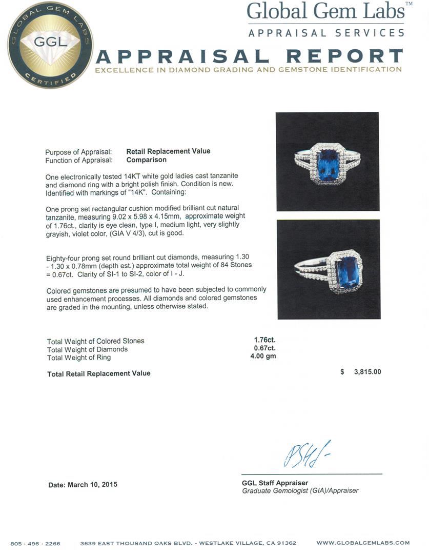 One electronically tested 14KT white gold ladies cast tanzanite and diamond ring with a bright polish finish. Identified with markings of "14K". Condition is new. Containing: One prong set rectangular cushion modified brilliant cut natural tanzanite, measuring 9.02 x 5.98 x 4.15mm, approximate weight of 1.76ct., clarity is eye clean, type I, medium light, very slightly grayish, violet color, (GIA V 4/3), cut is good. Eighty-Four prong set round brilliant cut diamonds, measuring 1.30 - 1.30 x 0.78mm (depth est.) approximate total weight of 84 Stones = 0.67ct. Clarity: SI-1 to SI-2. Color: I - J. Colored gemstones are presumed to have been subjected to commonly used enhancement processes. All diamonds and colored gemstones are graded in the mounting, unless otherwise stated. Total Weight of Colored Stones 1.76ct. Total Weight of Diamonds 0.67ct. Total Weight of Ring 4.00 grams. GGL Appraised at $3,815.00.