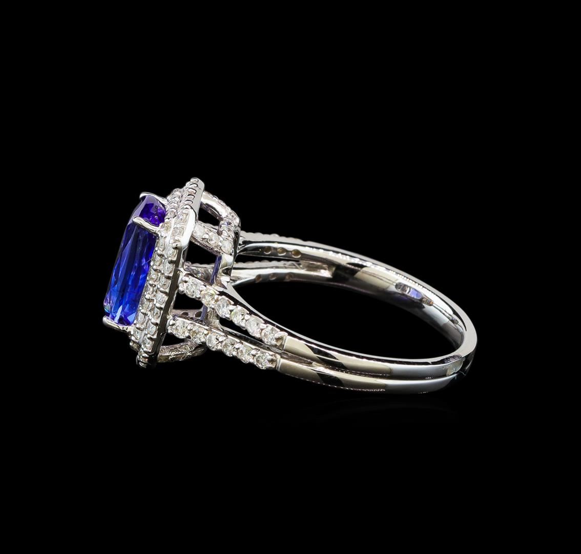 One electronically tested 14KT white gold ladies cast tanzanite and diamond ring with a bright polish finish. Identified with markings of "14K". Condition is new. Containing: One prong set rectangular cushion modified brilliant cut natural tanzanite, measuring 9.02 x 5.98 x 4.15mm, approximate weight of 1.76ct., clarity is eye clean, type I, medium light, very slightly grayish, violet color, (GIA V 4/3), cut is good. Eighty-Four prong set round brilliant cut diamonds, measuring 1.30 - 1.30 x 0.78mm (depth est.) approximate total weight of 84 Stones = 0.67ct. Clarity: SI-1 to SI-2. Color: I - J. Colored gemstones are presumed to have been subjected to commonly used enhancement processes. All diamonds and colored gemstones are graded in the mounting, unless otherwise stated. Total Weight of Colored Stones 1.76ct. Total Weight of Diamonds 0.67ct. Total Weight of Ring 4.00 grams. GGL Appraised.