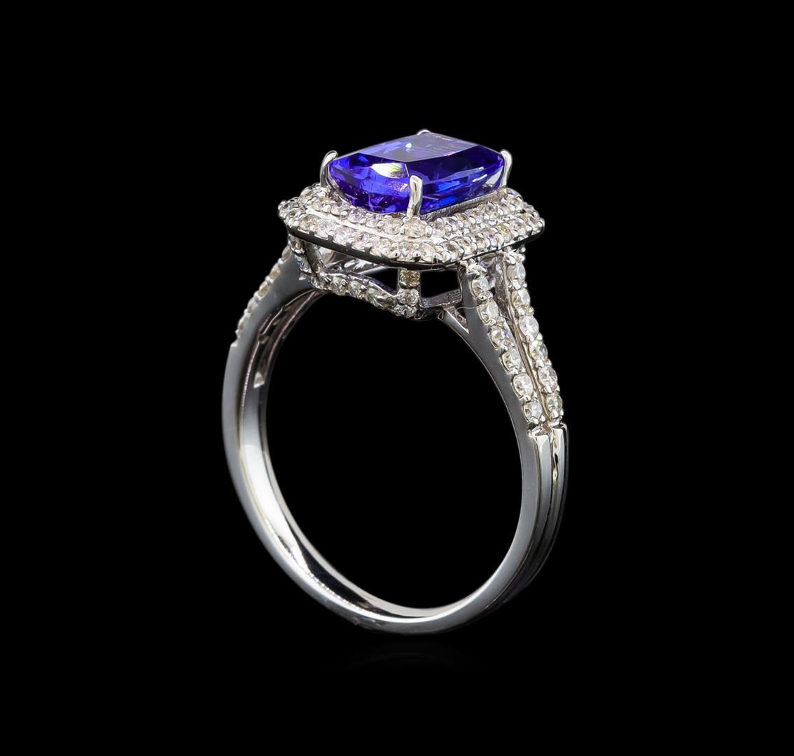 One electronically tested 14KT white gold ladies cast tanzanite and diamond ring with a bright polish finish. Identified with markings of "14K". Condition is new. Containing: One prong set rectangular cushion modified brilliant cut natural tanzanite, measuring 9.02 x 5.98 x 4.15mm, approximate weight of 1.76ct., clarity is eye clean, type I, medium light, very slightly grayish, violet color, (GIA V 4/3), cut is good. Eighty-Four prong set round brilliant cut diamonds, measuring 1.30 - 1.30 x 0.78mm (depth est.) approximate total weight of 84 Stones = 0.67ct. Clarity: SI-1 to SI-2. Color: I - J. Colored gemstones are presumed to have been subjected to commonly used enhancement processes. All diamonds and colored gemstones are graded in the mounting, unless otherwise stated. Total Weight of Colored Stones 1.76ct. Total Weight of Diamonds 0.67ct. Total Weight of Ring 4.00 grams. GGL Appraised.