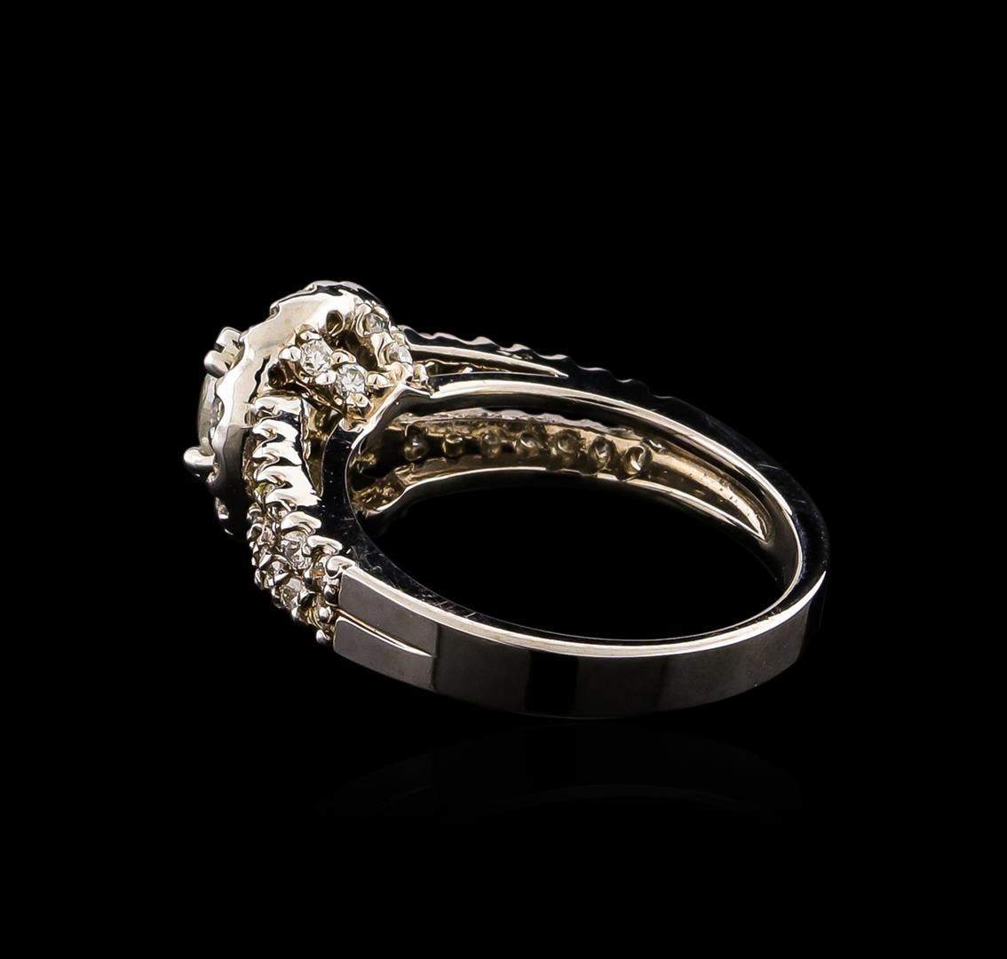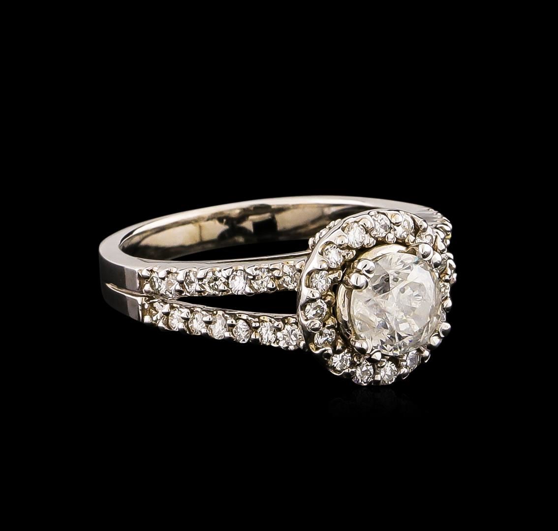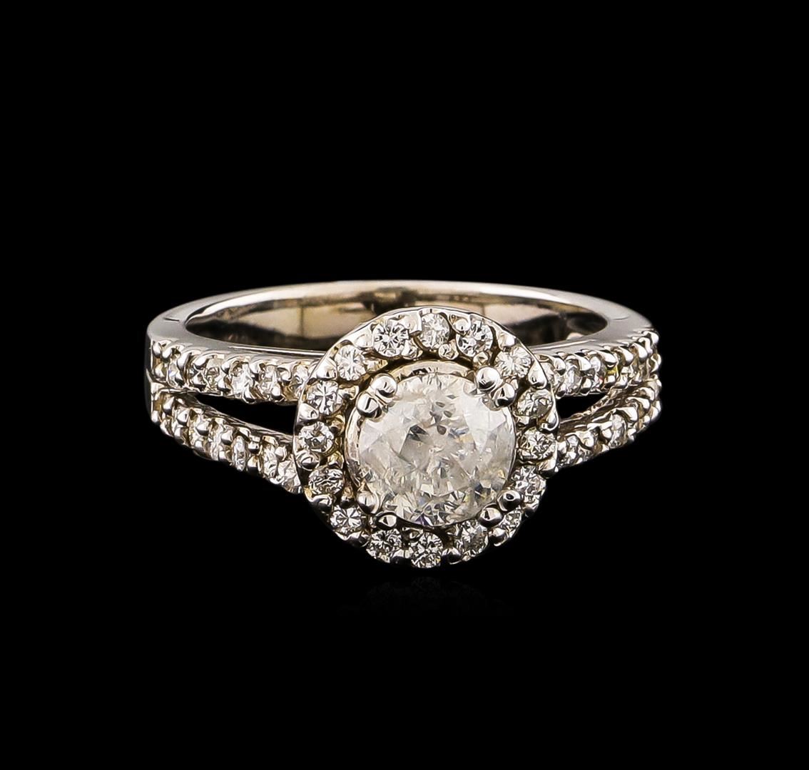 One electronically tested 14KT white gold ladies cast diamond unity ring with a bright polish finish. Condition is new, good workmanship. The featured diamond is set within a diamond bezel supported by diamond set split shoulders, completed by a two and one-half millimeter wide band. Identified with markings of "K14". Containing: One prong set round brilliant cut diamond, measuring 6.20 - 6.10 x 4.00mm (depth est.), 10.00.%. GTCF approximate weight of 1.09ct. Graded in the setting. Clarity: I-2. Color: 65.0%. Table 55.3%. Fifty-Two prong set round brilliant cut diamonds, measuring 1.60 - 1.50 x 0.93mm (depth est.) approximate. Total Weight of 52 Stones = 0.68ct. Graded in the setting. Clarity: VS-1 to SI-1. Color: G - I. Total Weight of Diamonds 1.77ct. Total Weight of Ring 5.38 grams. AIG Appraised at $12,820.00.