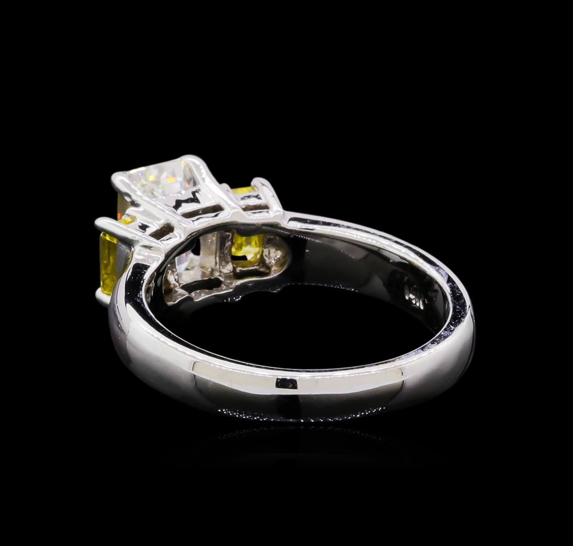One electronically tested 14KT white gold ladies cast diamond ring with a bright polish finish. Condition is new, good workmanship. The ring features a diamond accented by a single diamond on either side, completed by a three millimeter wide band. Identified with markings of "14K". Containing: One prong set emerald shaped cut diamond, measuring 7.30 x 4.90 x 3.30mm (depth est.) approximate weight of 1.10ct, fracture filled with a medium blue fluorescence. Fracture filling has no tolerance to ultrasonic and steam cleaning. Graded in the setting. Clarity I-2. Color I. Depth 67.4%. Table 73.5%. Two prong set emerald shaped cut diamonds, measuring 4.40 x 3.20 x 2.20mm (depth est.) approximate total weight of 2 Stones = 0.67ct. Indications of laboratory irradiated enhanced color. Graded in the setting. Clarity SI-1. Color Fancy Vivid Yellow. Total Weight of Diamonds 1.77ct. Total Weight of Ring 5.31gm. AIG Appraised at $7,050.00.