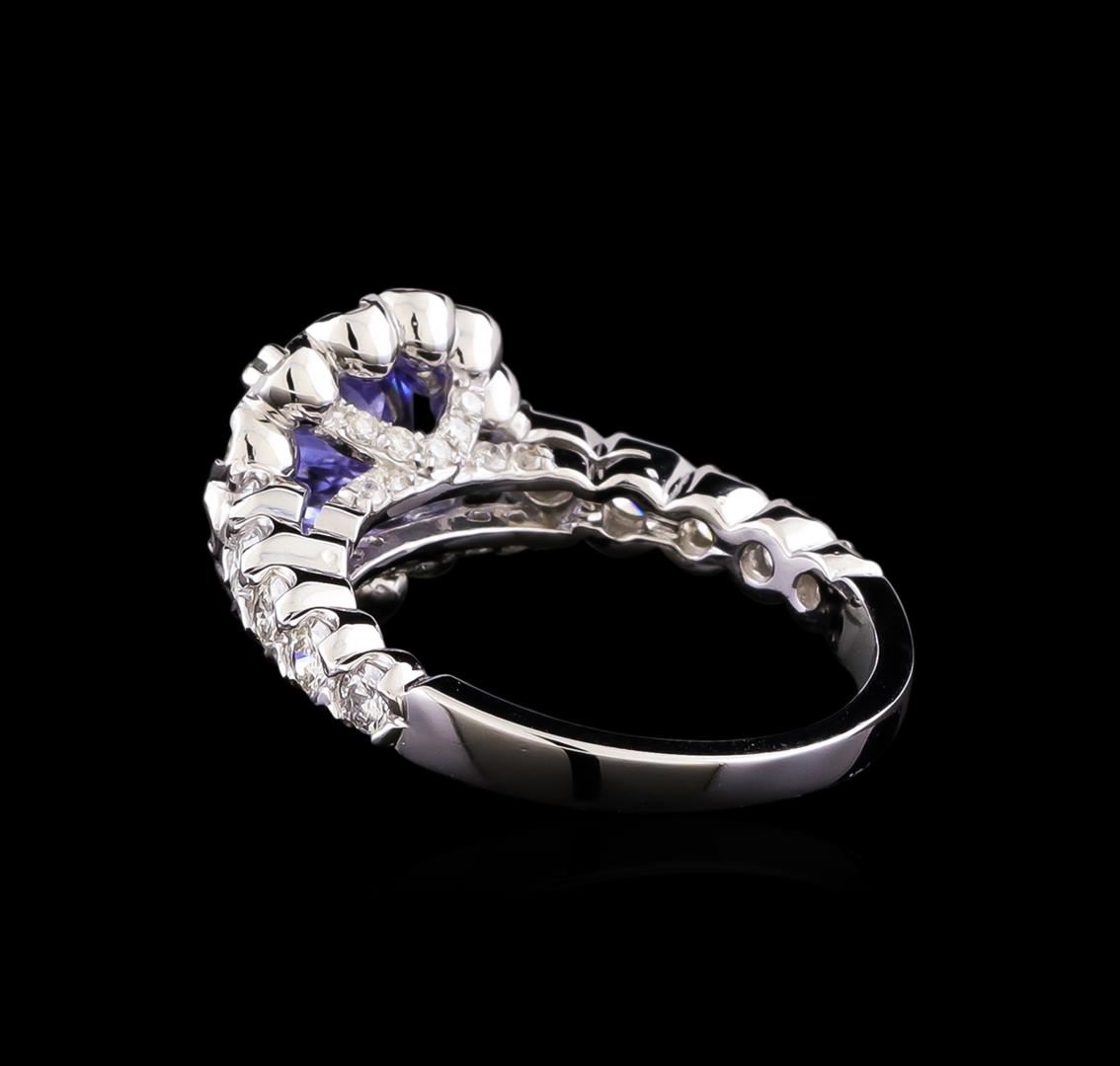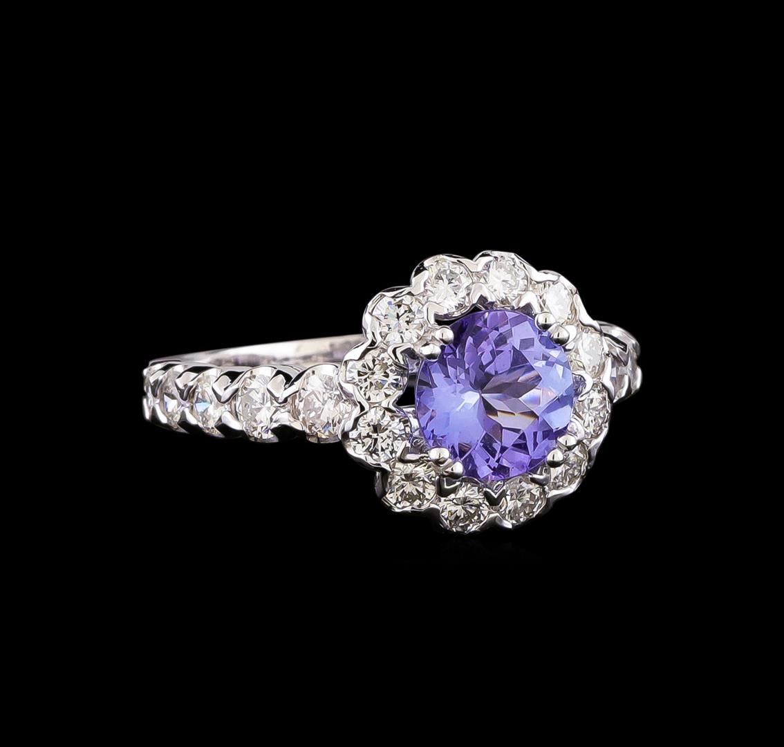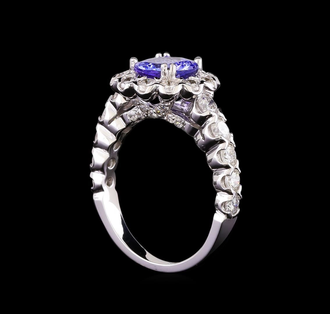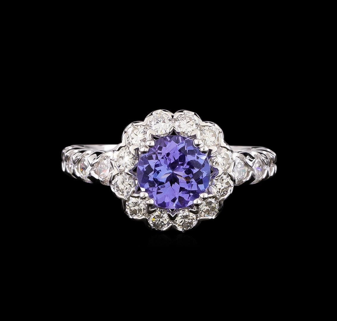 One electronically tested 14KT white gold ladies combination cast & assembled tanzanite and diamond ring with a flat shank with a bright polish finish. Identified with markings of "14K". Condition is new. Containing: One prong set round modified brilliant cut natural tanzanite, measuring 7.30 - 7.30 x 4.95 mm, approximate weight of 1.77ct., clarity is eye clean, type I, medium light, very slightly grayish, violet color, (GIA V 4/3), cut is good. Twenty-Two prong set round brilliant cut diamonds, measuring 2.90 - 2.50 x 1.62mm (depth est.) approximate total weight of 22 Stones = 1.58ct. Clarity: SI-2. Color: I - K, Cut is Good. Colored gemstones are presumed to have been subjected to commonly used enhancement processes. All diamonds and colored gemstones are graded in the mounting, unless otherwise stated. Total Weight of Colored Stones 1.77ct. Total Weight of Diamonds 1.58ct. Total Weight of Ring 4.80 grams. GGL Appraised at $5,315.00.